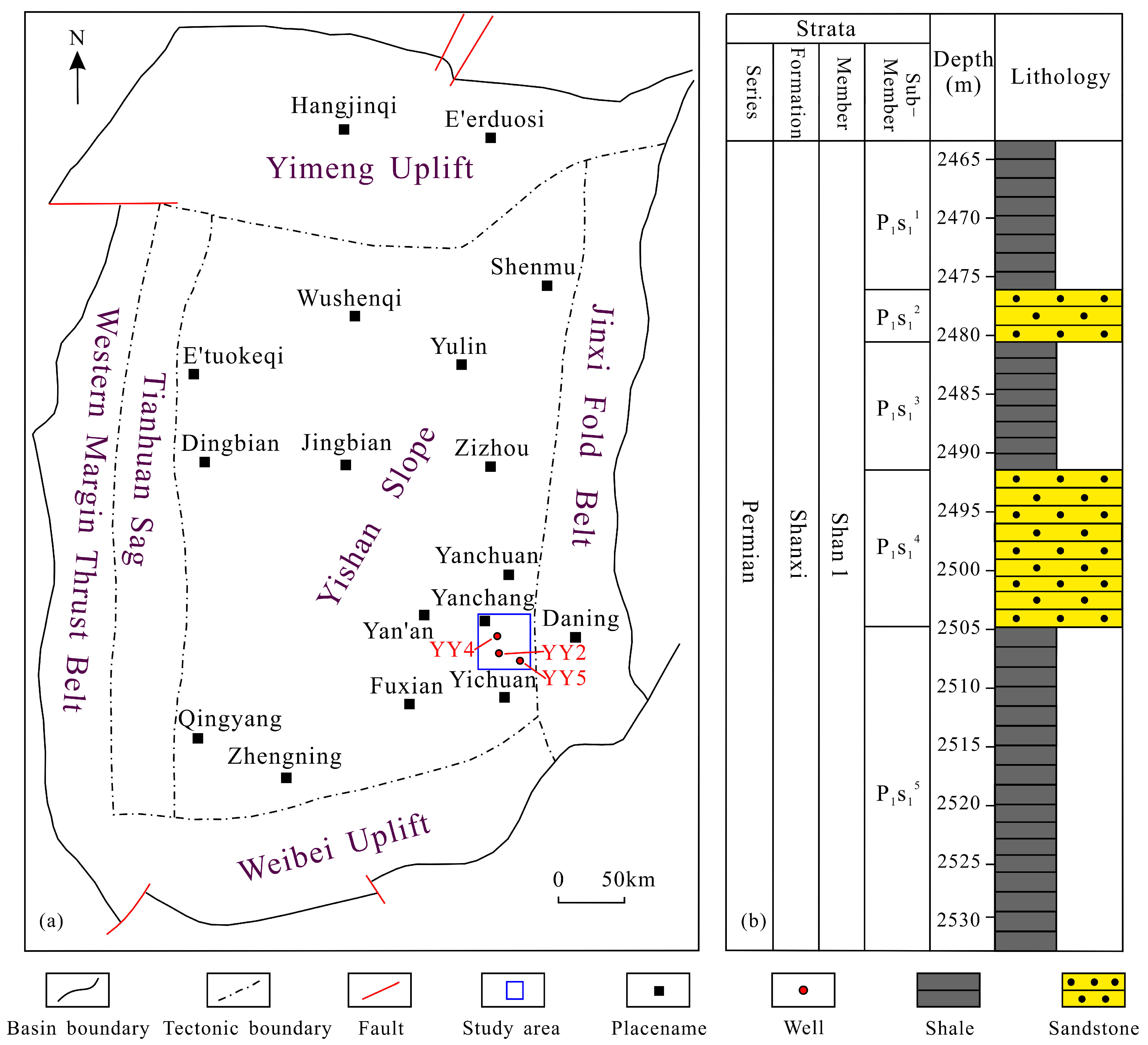 - Duan, Y.F.; Zhao, W.W.; Yang, T.X.; Li, F.K.; Li, H.; Wang, J.; Liu, Y.C. Source-reservoir characteristics and accumulation rules of shale gas of Permian Shanxi Formation in Yan’an area, Ordos Basin. Lithol. Reserv. 2024, 36, 72–83. (In Chinese) [Google Scholar] [CrossRef]