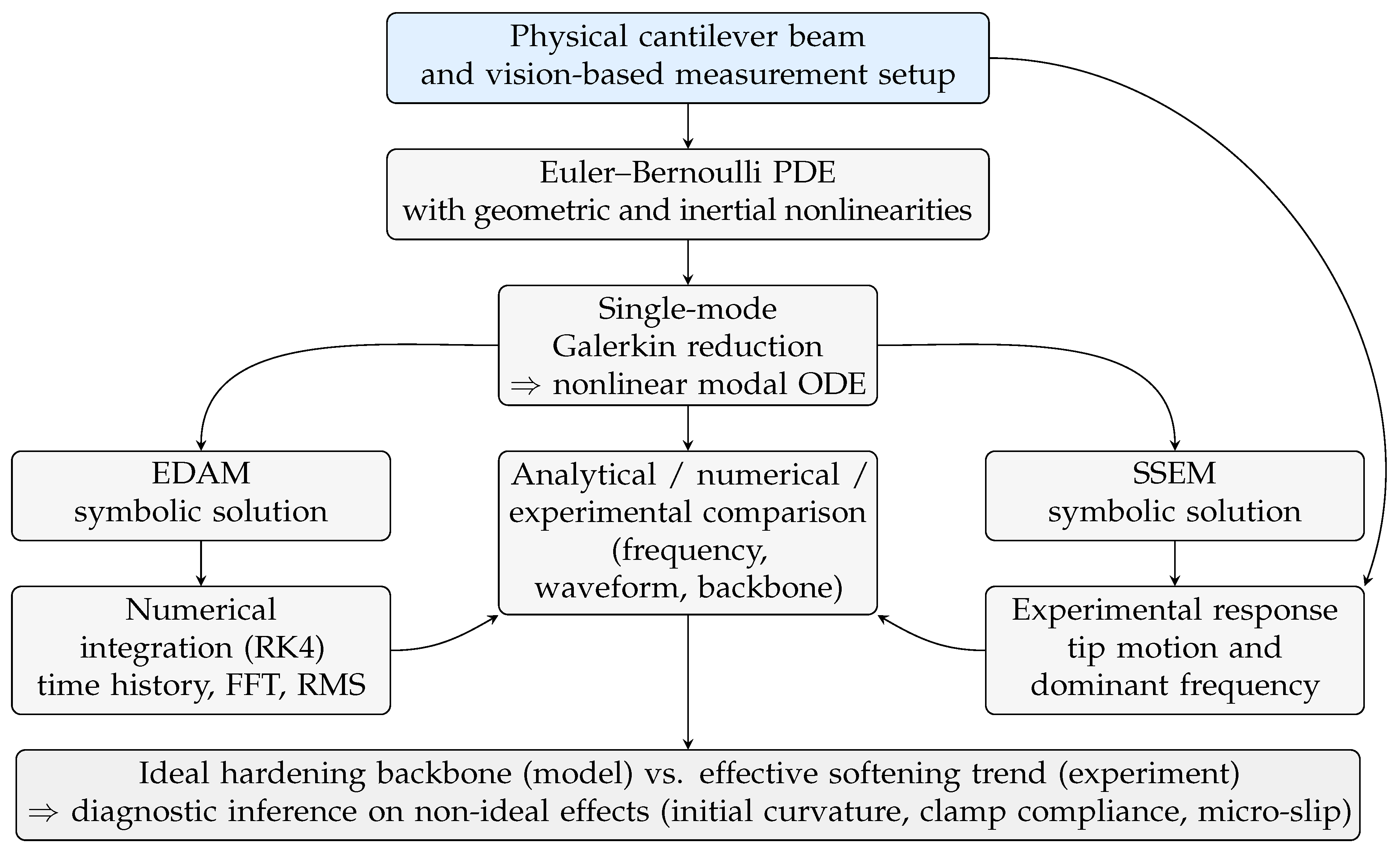 The role of the analytical model thus extends beyond prediction. It acts as a virtual baseline that isolates non-ideal physical effects in the real structure. In this sense, the combination of symbolic closed-form solutions and high-resolution experimental measurements provides a robust framework for interpreting nonlinear dynamics in slender cantilever beams. Although the present study focuses on a single specimen, the analytical–experimental workflow is directly transferable to other cantilever configurations with comparable modal separation.
