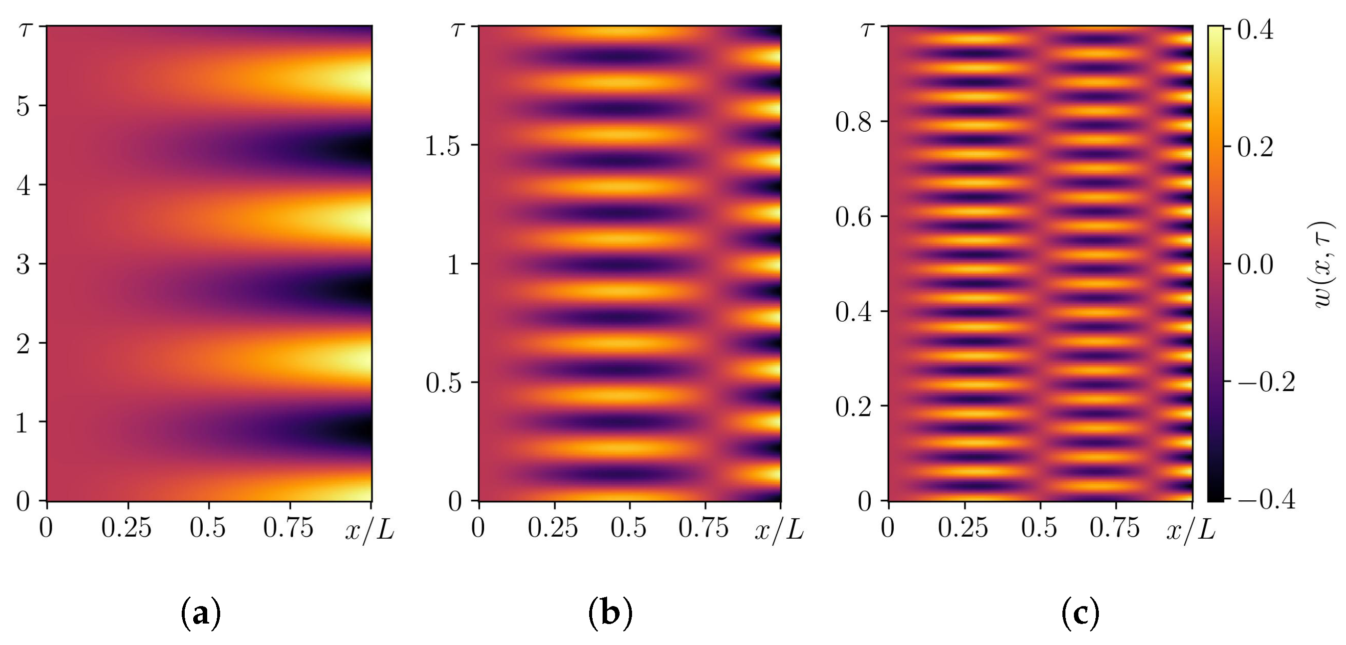 Here, denotes the second derivative with respect to . The individual terms can be interpreted as —linear modal stiffness, —cubic geometric stiffness nonlinearity (finite-slope effect), —nonlinear inertia (from axial inertia associated with finite slopes), and —amplitude-dependent inertia (inertial nonlinearity).