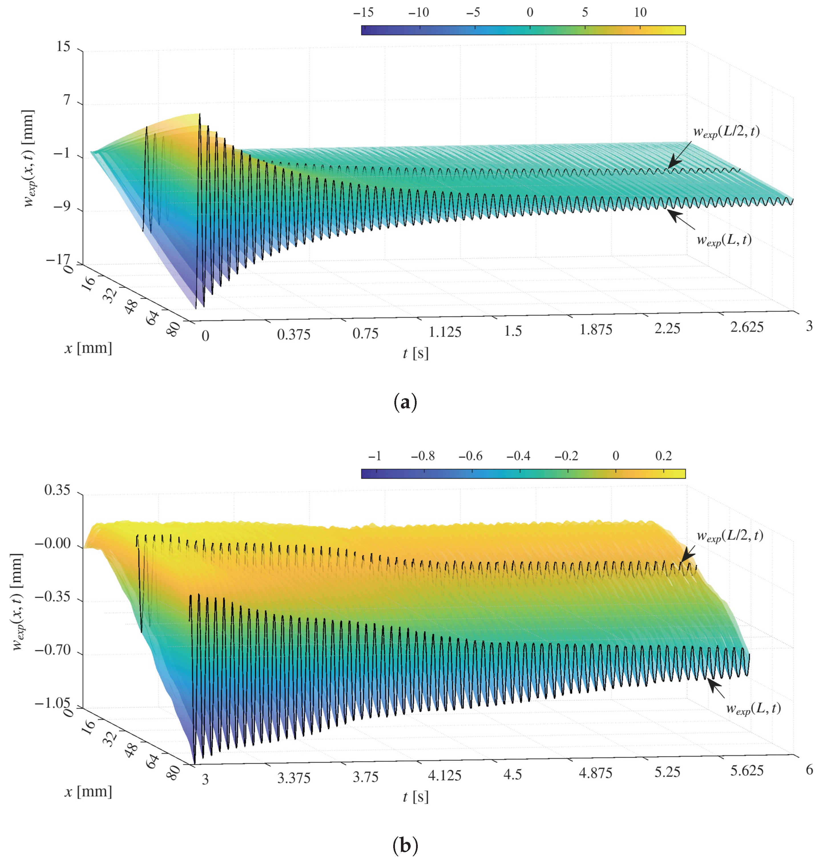 The observed deformation surfaces further indicate a clear dominance of the first bending mode throughout the analyzed response. In particular, the spatial profiles remain smooth and monotonic along the beam length, without the appearance of internal nodes or localized curvature reversals that would be indicative of higher bending modes. This behaviour persists both during the initial transient and in the subsequent quasi-steady regime, despite the gradual amplitude decay.