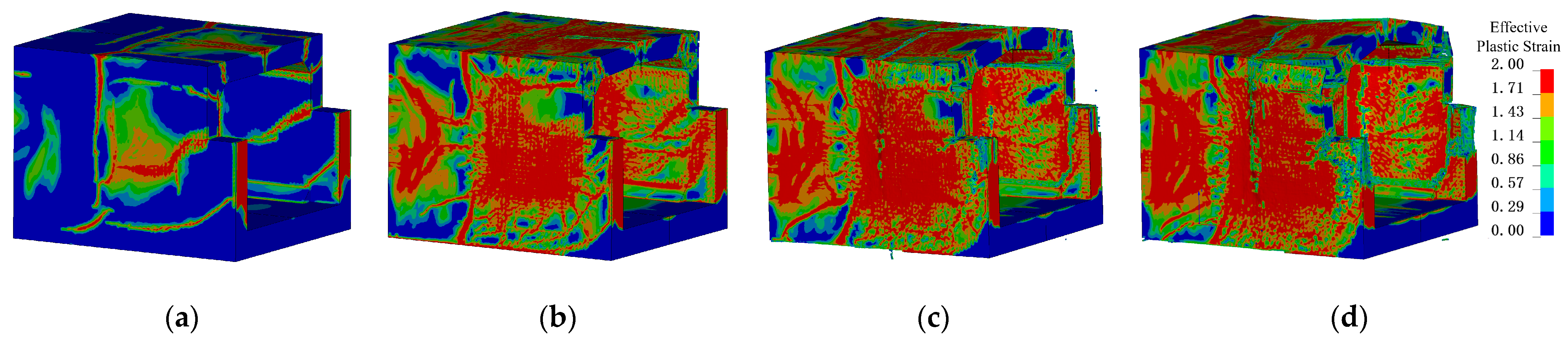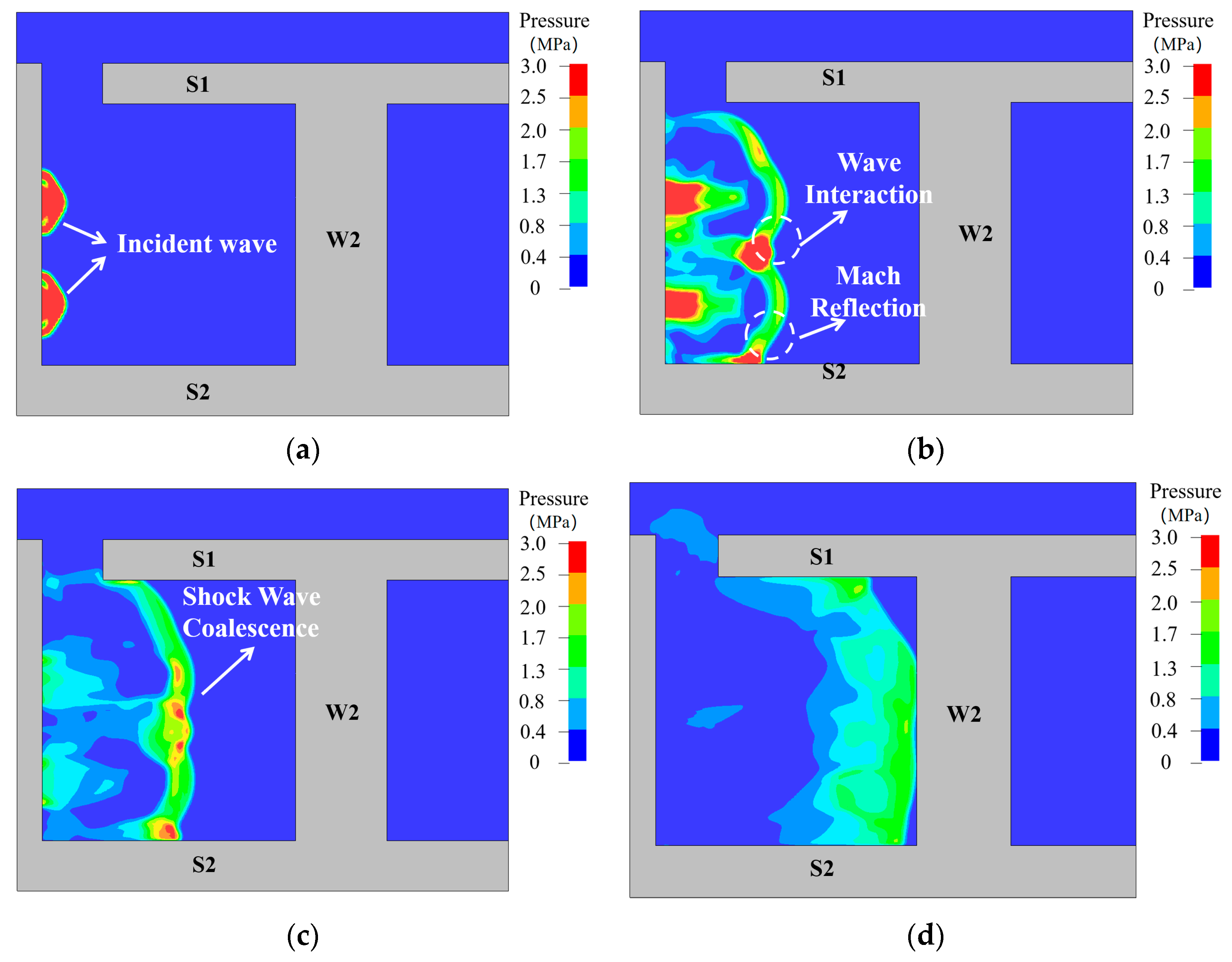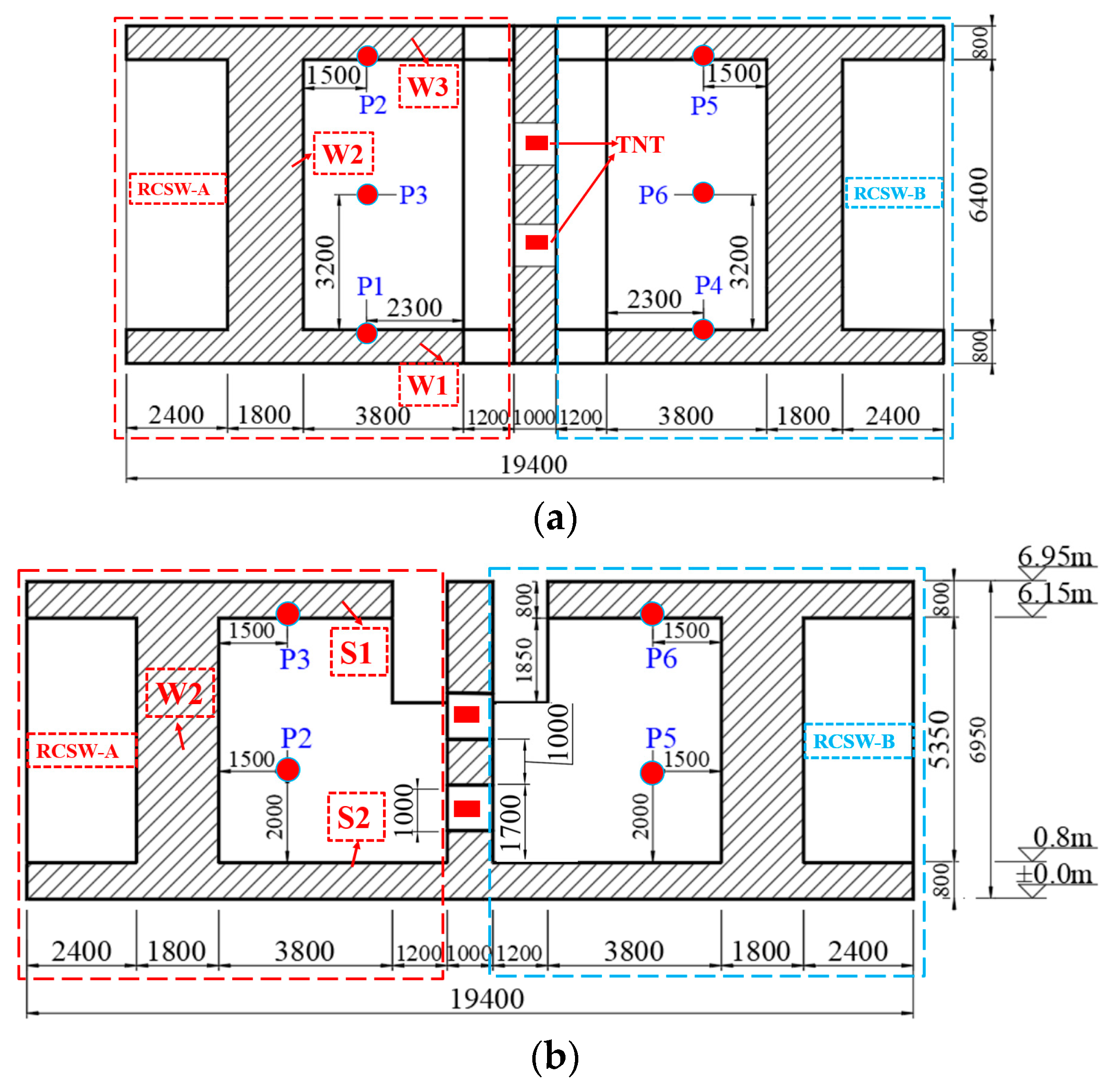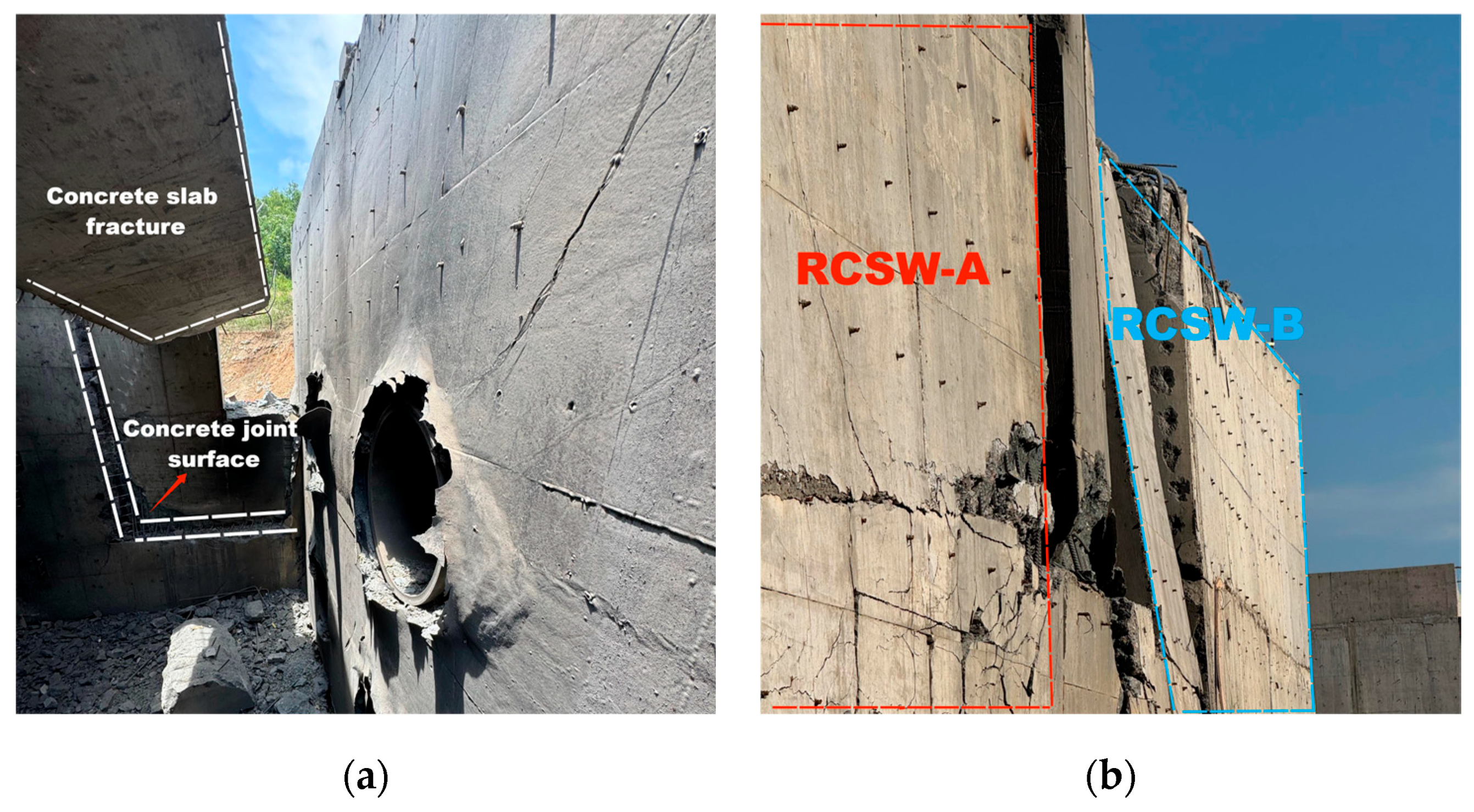 Figure 18 illustrates the damage evolution process of RCSW-A. Approximately 2 ms after the TNT detonation, the blast wave impacted the side walls of the structure. Around 4 ms, stress waves propagated to the outer surface, generating tensile waves that caused tensile damage in the concrete at the center of the rear surface of wall W1, with the damaged area developing obliquely. Simultaneously, shear cracks appeared at the wall–slab joint locations.