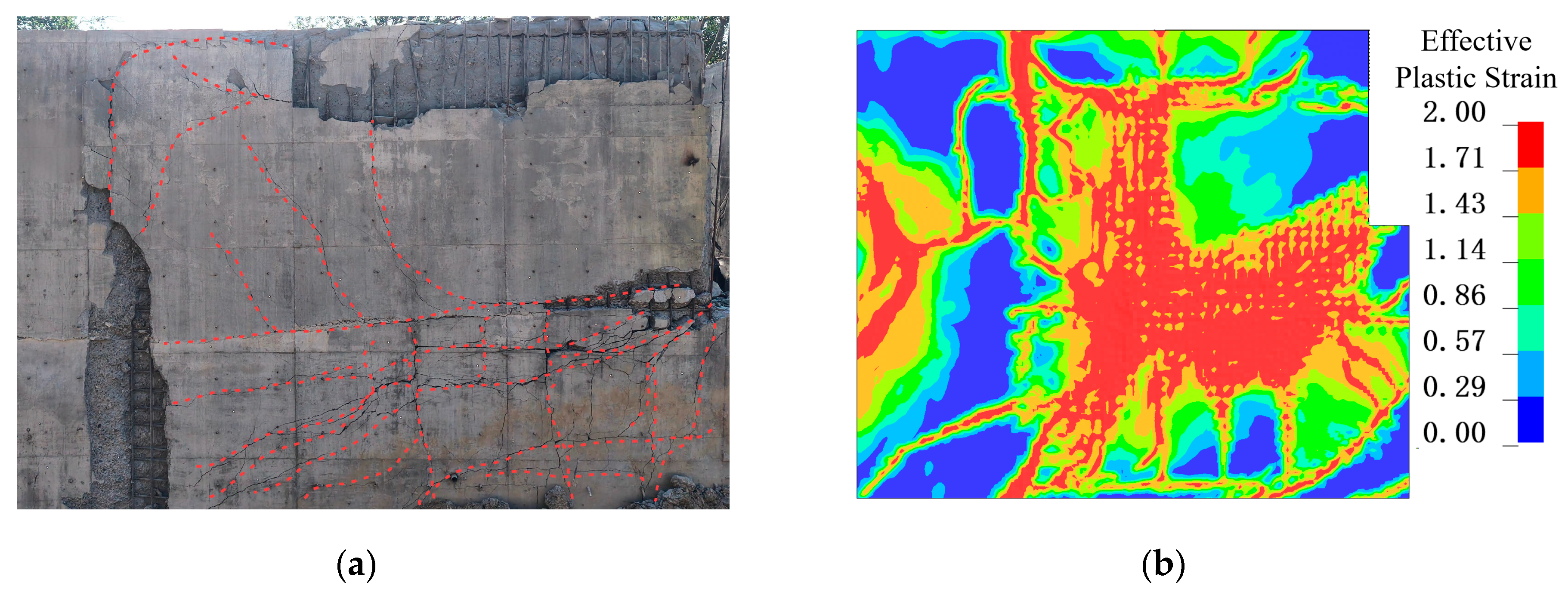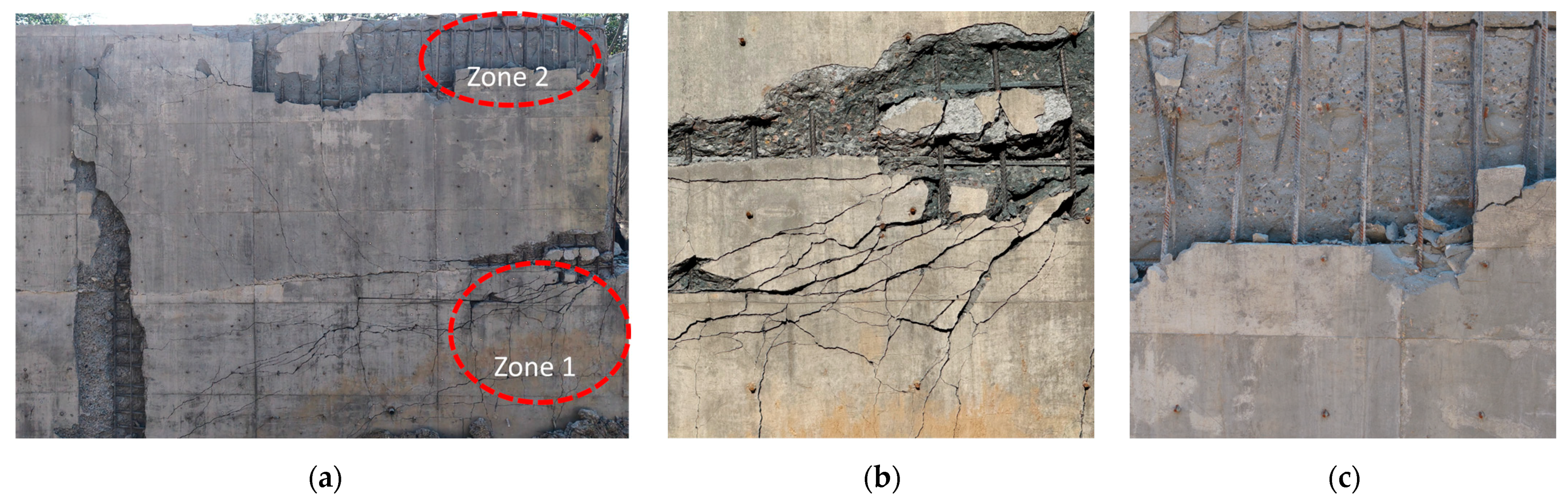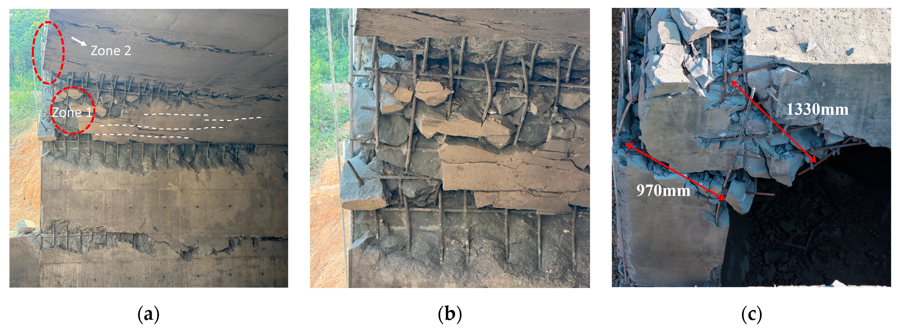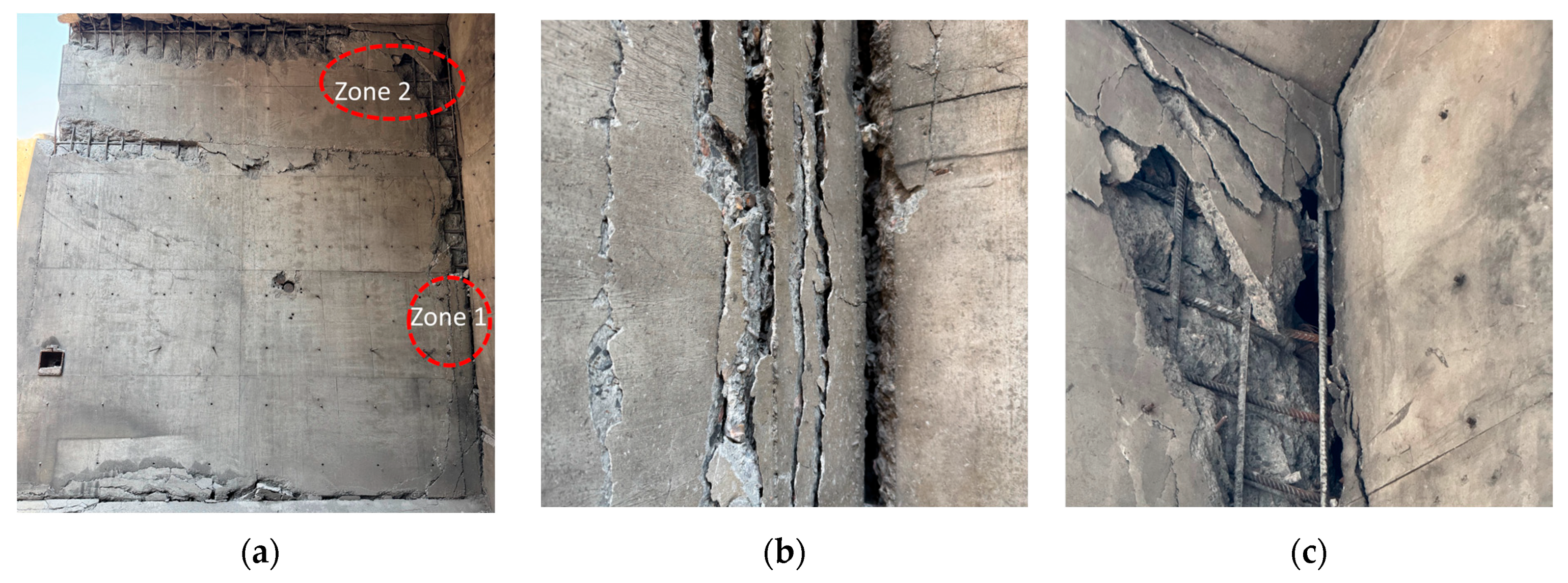Stage 2—Coupled Shear-Bending Response: If the nodes possess sufficient strength, and the shear cracks from the early phase do not penetrate the full section, the member can develop adequate end constraints and enter a combined shear-bending response. The panels and walls move outward under the explosion pressure, bending cracks form near mid-span, and rotations at the supports generate negative bending moments, which further accelerate the propagation of early shear cracks. However, if the node strength is insufficient, the initial shear cracks quickly penetrate the section as bending begins, resulting in limited member deformation and a brittle failure characteristic.