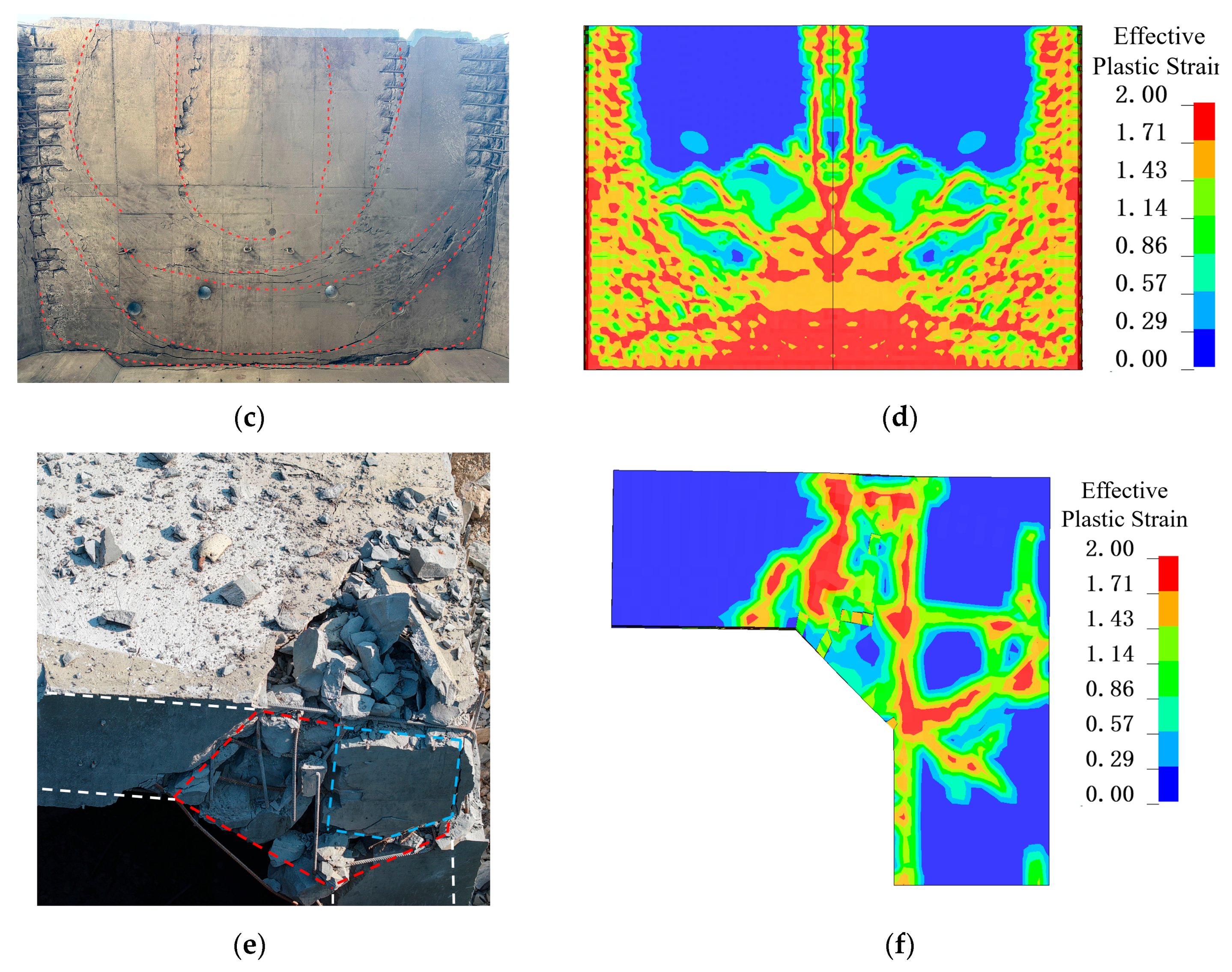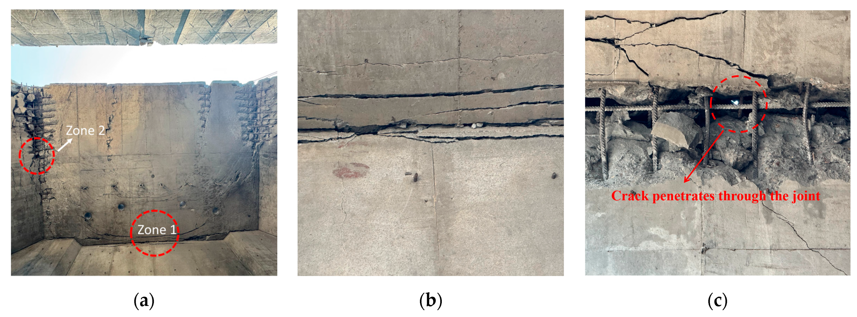 Figure 11a, where horizontal cracks are uniformly distributed across the sloped surface, perpendicular to the inclined reinforcement. By 30 ms, the joint was completely surrounded by failure surfaces, forming a plastic hinge; thereafter, the joint relied entirely on the reinforcement to maintain structural integrity.