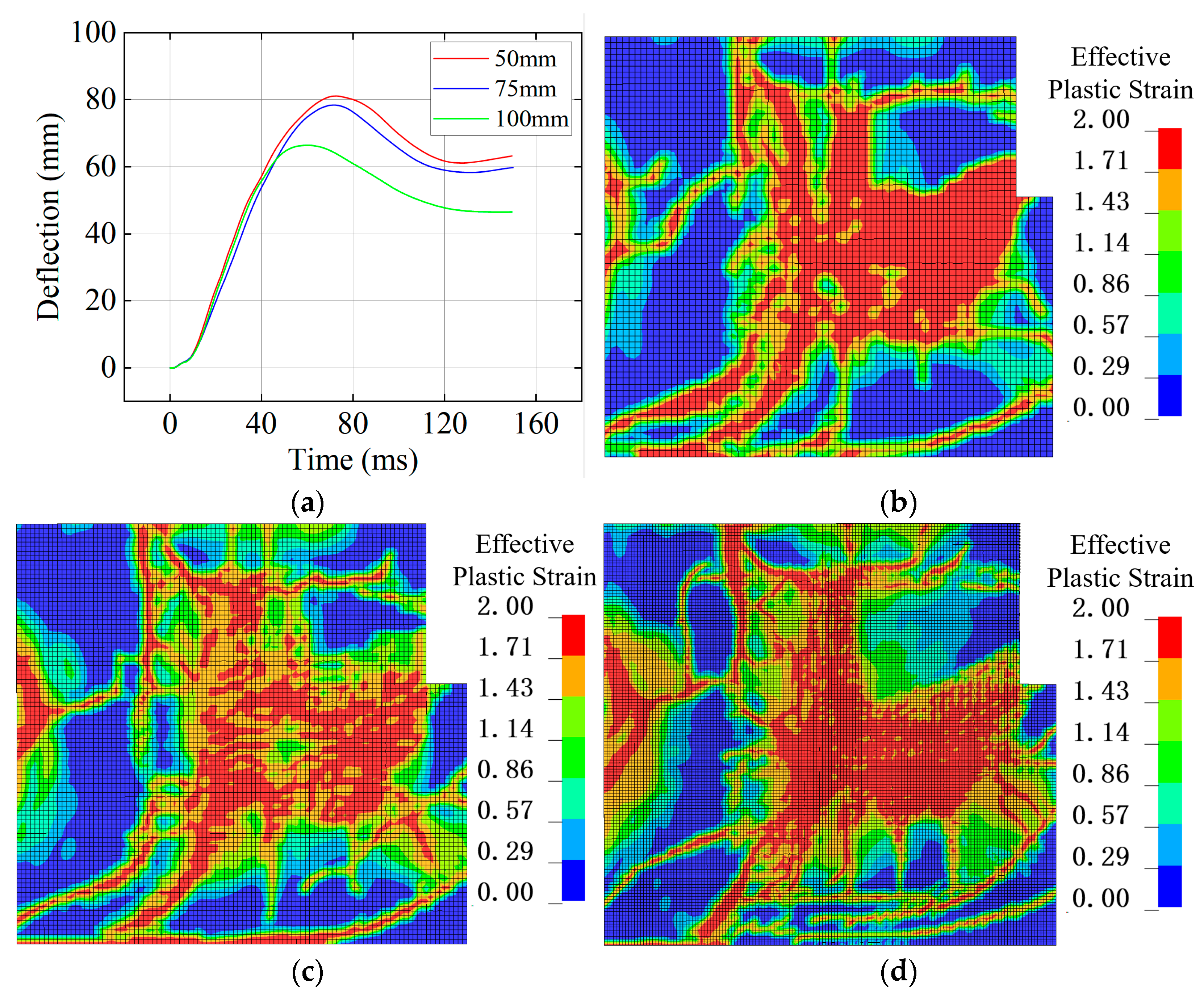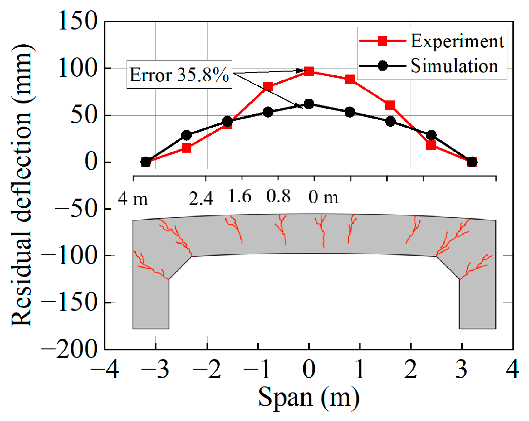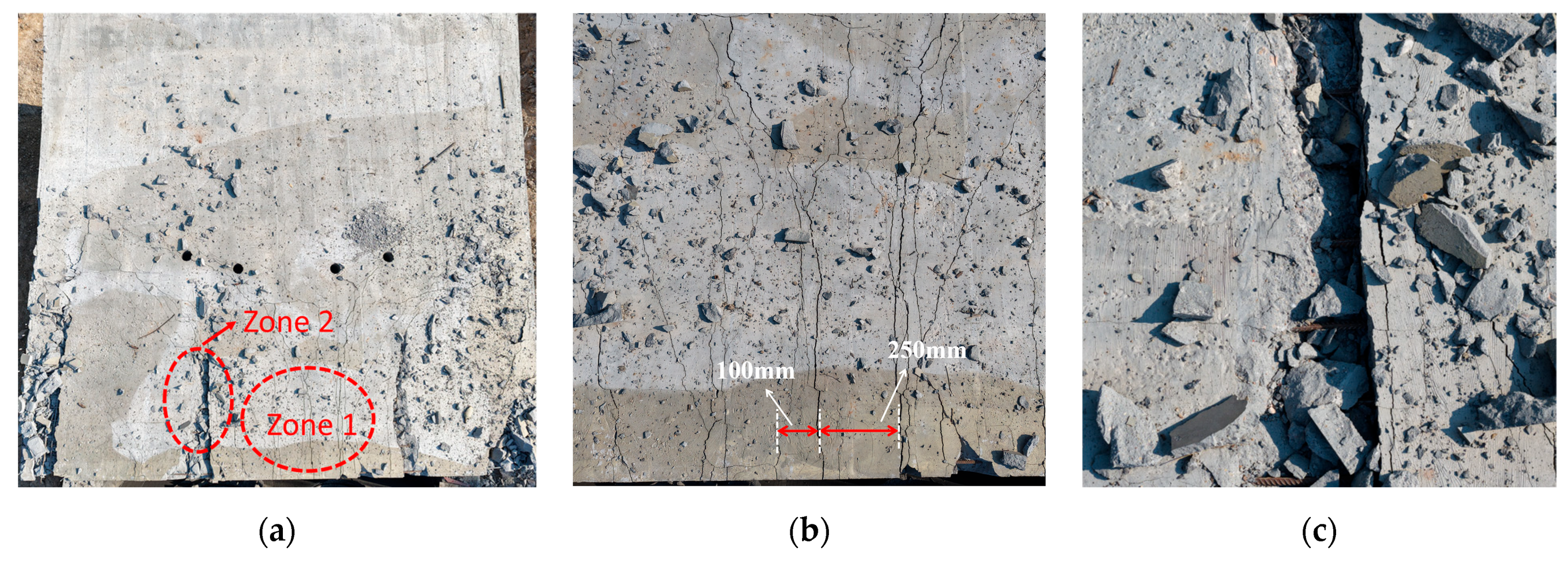 Stage 3—Late Bending Phase: During the later bending response, the explosive load has dissipated, and the structure is mainly influenced by inertia. If the member’s kinetic energy is low at this stage, the deformation stabilizes, with cracks at the supports potentially becoming through-cracks. If the reinforcement is intact and sufficiently strong, the member exhibits clear peak and residual displacements. Conversely, if significant kinetic energy remains and the supports fail completely, the reinforcement bears all tensile forces; if the reinforcement strength is insufficient, the member may detach entirely, leading to structural collapse.