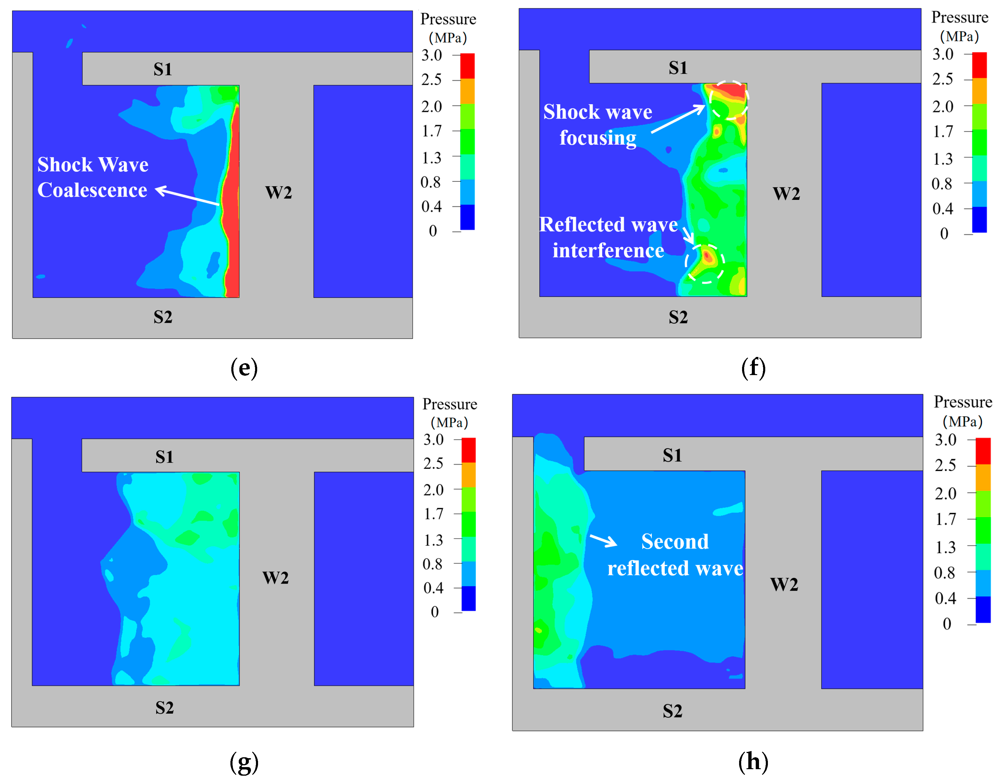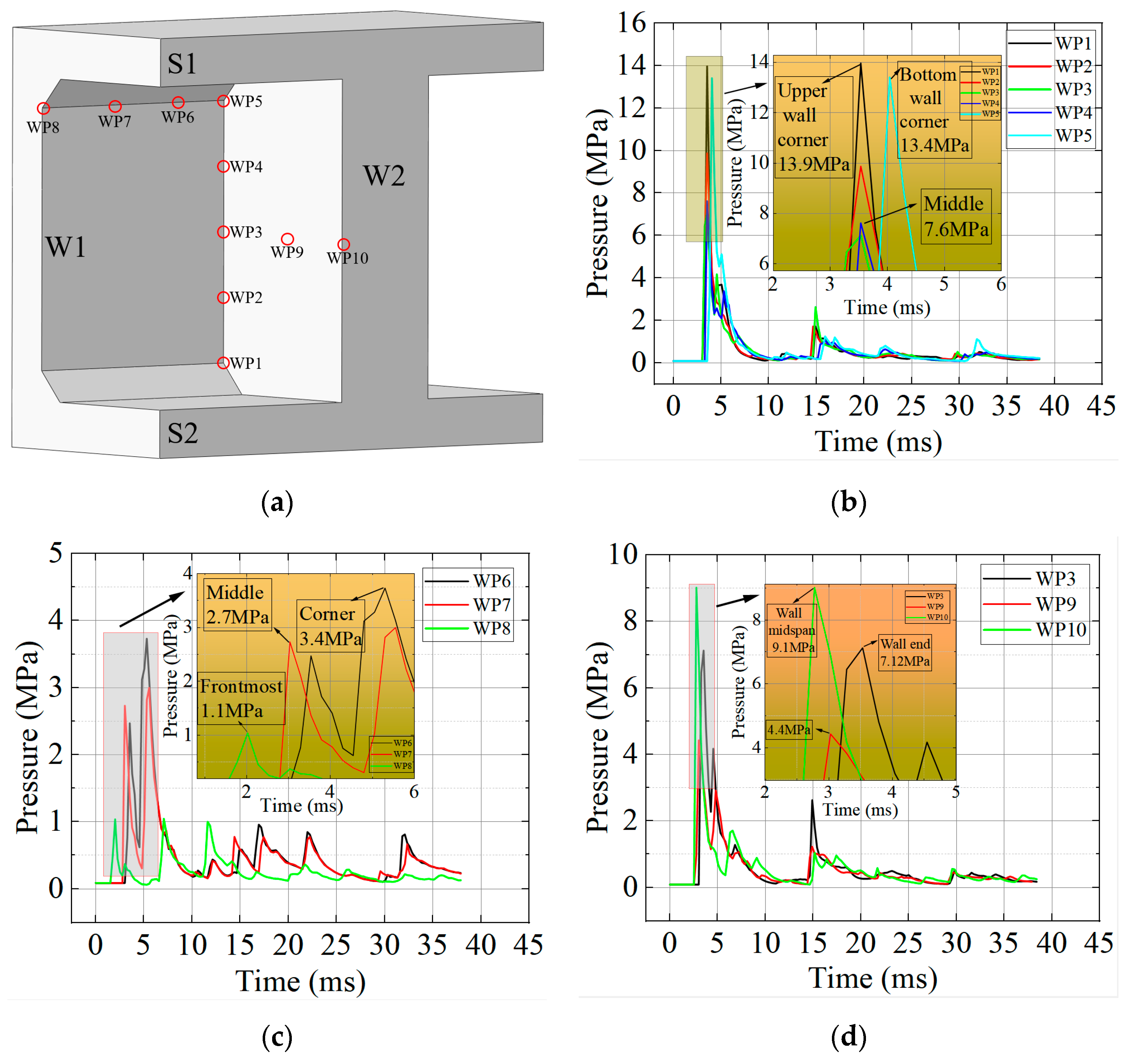 By 5 ms, the cracks on the rear surface of W1 rapidly extended upward to the edges of the component, while the damage zone in the concrete expanded outward from the component center. At 7 ms, vertical cracks at the left end reached the intersection of W1 and the lower surface of S1, forming horizontal cracks. Prior to 7 ms, the components primarily experienced shear damage. By 10 ms, the crack distribution at the supports had stabilized, whereas the damage in the central concrete of the walls continued to expand. By approximately 100 ms, the overall structural damage had essentially reached its final extent.