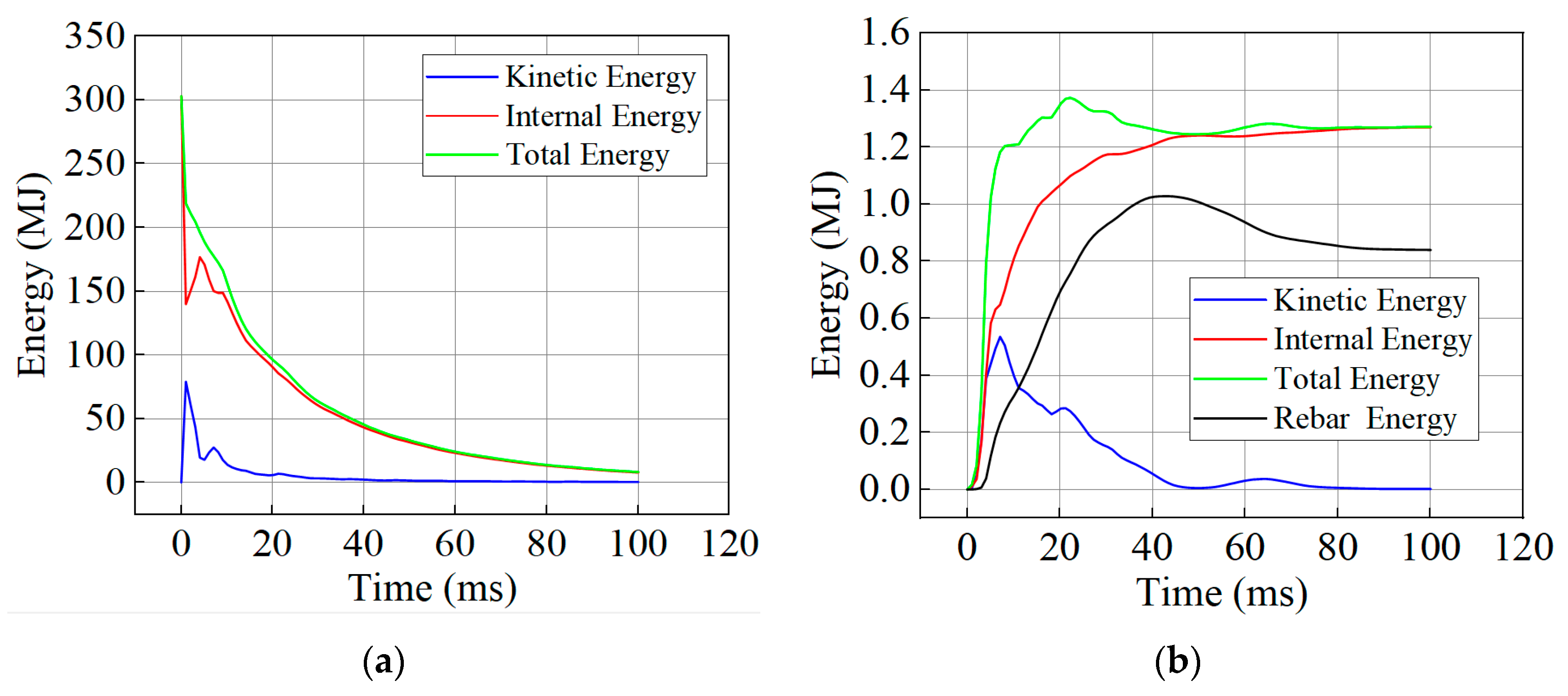 Figure 20b also shows that during the initial blast phase, the total energy absorbed by the steel was far lower than that absorbed by the concrete.