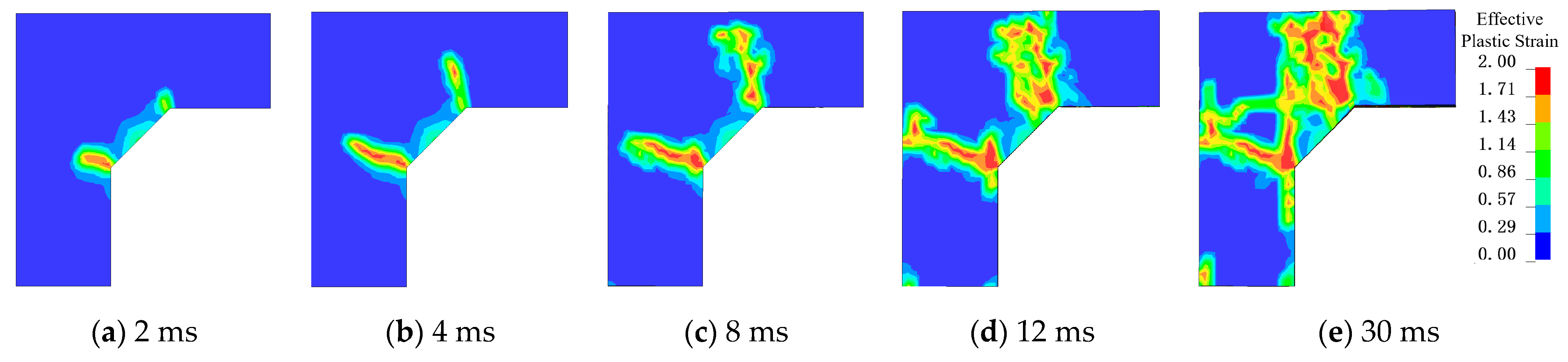 Figure 19 illustrates the damage progression of joint J1. At 2 ms, shear damage appeared in the concrete at the bottom of the joint—where the wall and slab cross-sections change. By 4 ms, these bottom cracks evolved into macroscopic oblique cracks and continued propagating upward. The shear cracks formed in less than 2 ms, primarily due to stress wave reflection and superposition at the joint. The elastic modulus of concrete is significantly lower than that of steel reinforcement, so the stress borne by the steel at this stage is relatively small. As shown in