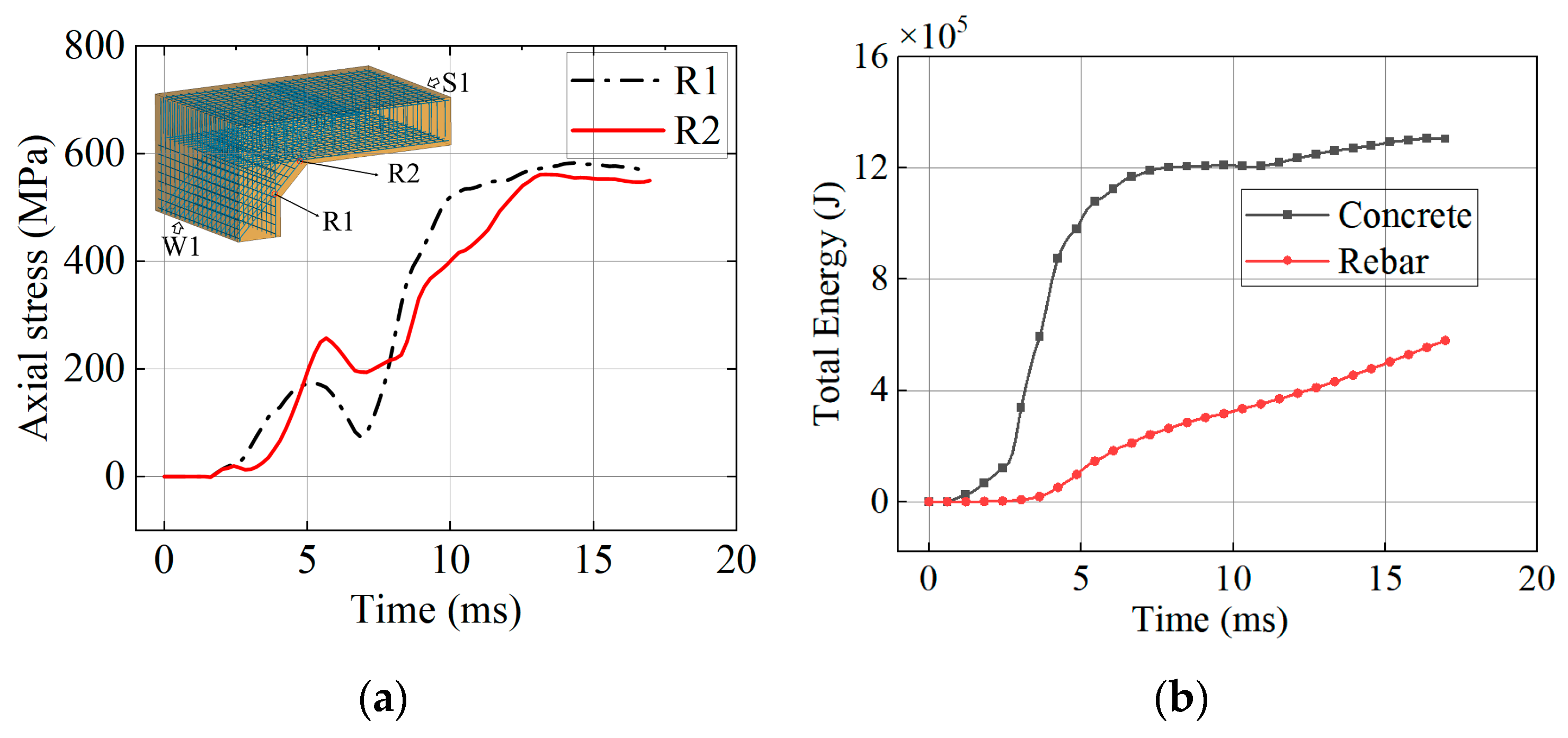 Figure 17 illustrates the energy evolution process of the air, concrete, and reinforcement. Upon the detonation of the TNT, chemical energy is instantaneously converted into the internal and kinetic energy of the air, followed by an exponential decay. When the incident shock wave impinges on the concrete wall, the significant acoustic impedance mismatch between the air and the concrete generates a reflected overpressure. This pressure pulse performs mechanical work on the structural surface, facilitating the rapid transfer of the shock wave’s kinetic energy to the structure. Within a few milliseconds, the total energy of the concrete and reinforcement rises sharply. However, the energy absorption of the reinforcement exhibits a distinct time lag relative to the concrete. This phenomenon is attributed to the fact that the concrete initially dissipates energy through local shear failure, whereas the reinforcement requires the structure to undergo sufficient deformation before it can significantly participate in energy absorption.