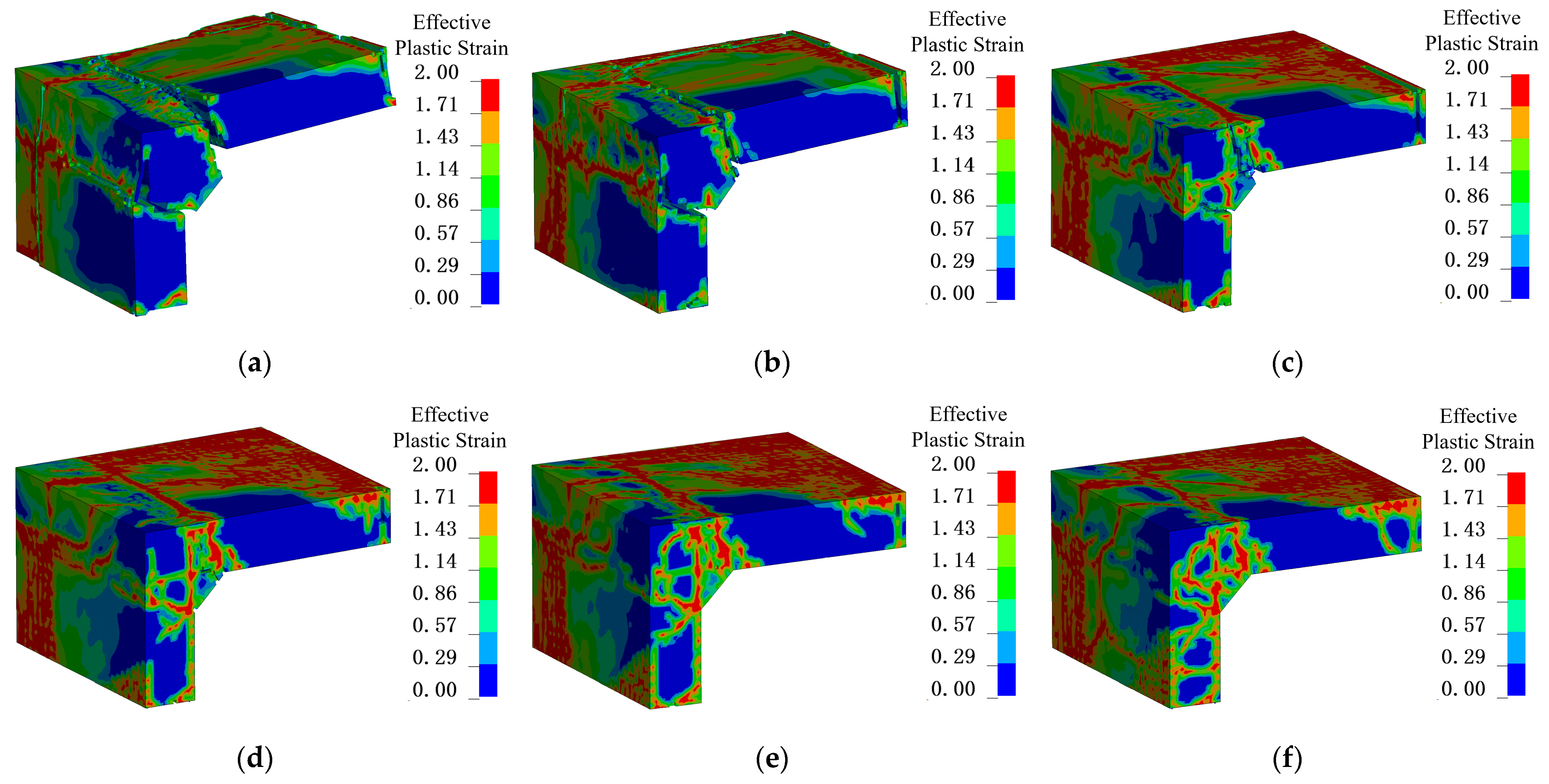 Stress waves generated within a component not only reflect at the back-explosion surface but also propagate and superimpose at the node region. Stress waves originating from adjacent components cause shear stress to rise rapidly. Due to the characteristics of internal blast loading, the components are subjected to multiple peak reflected pressures and long-duration positive pressure, which produces a relatively uniform surface load over the member. As a result, the component experiences extremely high acceleration. Because the component does not have sufficient time to deform, large constraint reactions develop at the supports, leading to pronounced stress concentrations. Coupled with stress wave reflections at the joints, the edge concrete rapidly reaches its maximum tensile strength, initiating cracks that propagate obliquely inward. This phenomenon occurs in both experimental tests and numerical simulations, with nearly all joints exhibiting shear cracks. Although this type of damage develops more slowly than the direct stress-wave-induced damage, it is still classified as local damage.
