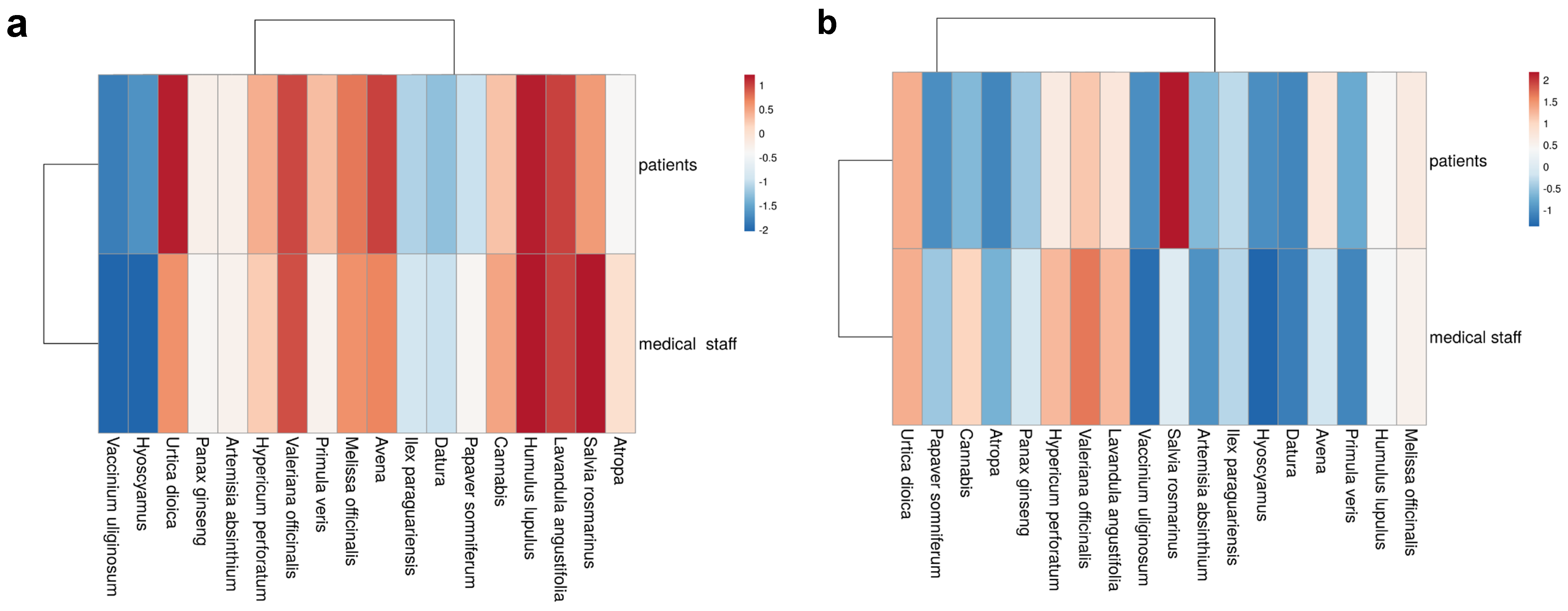 | Euphoric/invigorating | 59 | Allium_cepa, Allium_sativum, Allium_schoenoprasum, Allium_ursinum, Anchusa_officinalis, Armoracia_rusticana, Arnica_montana, Artemisia_umbelliformis, Betonica_officinalis, Camellia_sinensis, Carlina_acaulis, Cichorium_intybus Cinnamomum_camphora, Cochlearia_officinalis, Cupressus, Daucus_carota, Elettaria_cardamomum, Eleutherococcus_senticosus, Ephedra, Erica, Galanthus, Geum_urbanum, Glycine_max, Hippopha_rhamnoides, Hyssopus_officinalis, Illicium_verum, Juglans_regia, Linum, Lycium_barbarum, Mentha, Mercurialis_perennis, Myosotis, Myristica_fragrans, Panax_ginseng, Panicum_miliaceum, Paullinia_cupana, Petasites, Peucedanum_ostruthium, Piper_nirgum, Polygala, Pulsatilla, Punica_granatum, Rosa_corymbifera, Ruta_graveolens, Saliva_officinalis, Salvia_rosmarinus, Salvia_sclarea, Satureja, Serenoa_repens, Sium_sisarum, Solanum_lycopersicum, Syzygium_cumini, Taraxacum, Theobroma_cacao, Thuja, Thymus_officinalis, Urtica, Valeriana_celtica, Vitis_vinifera |