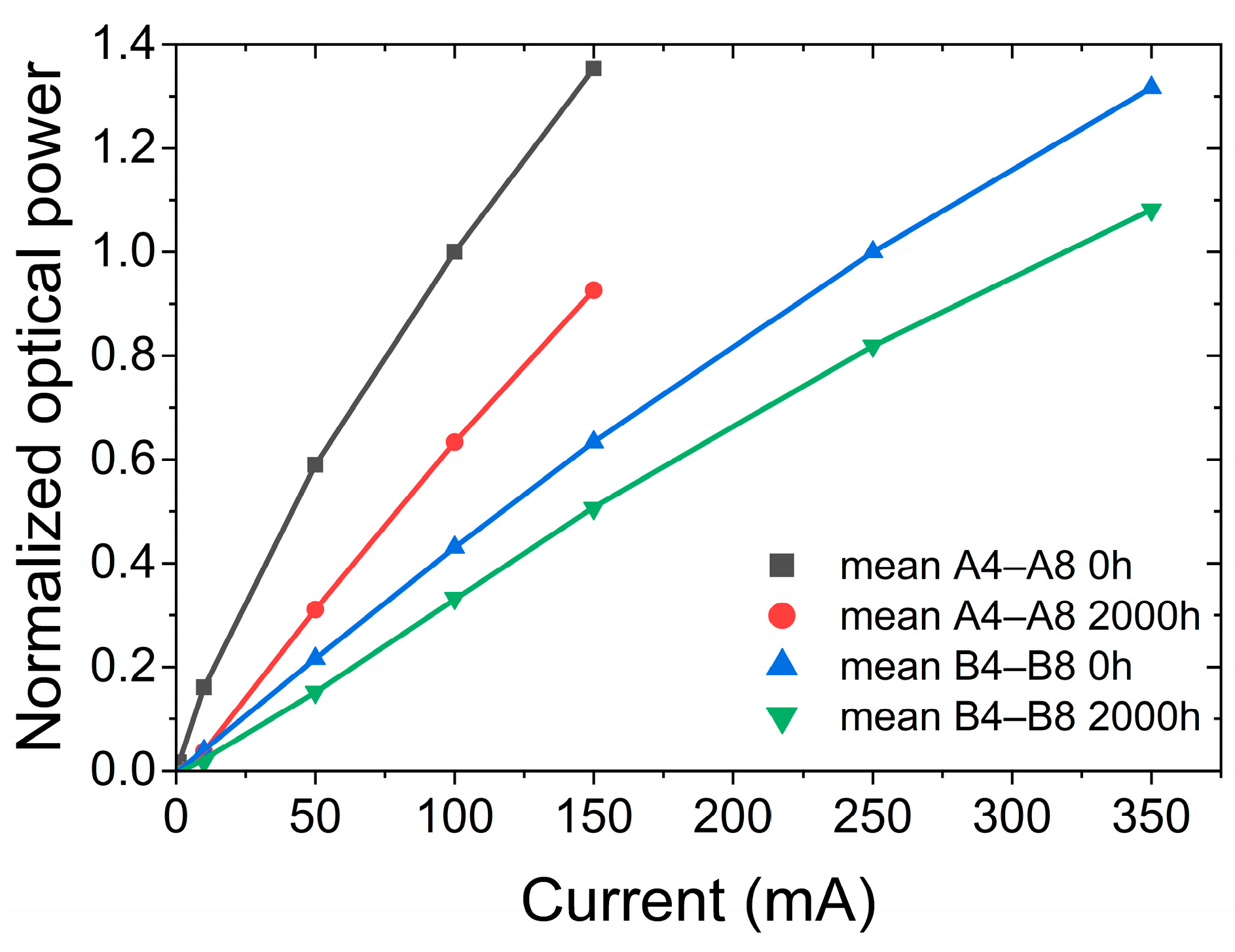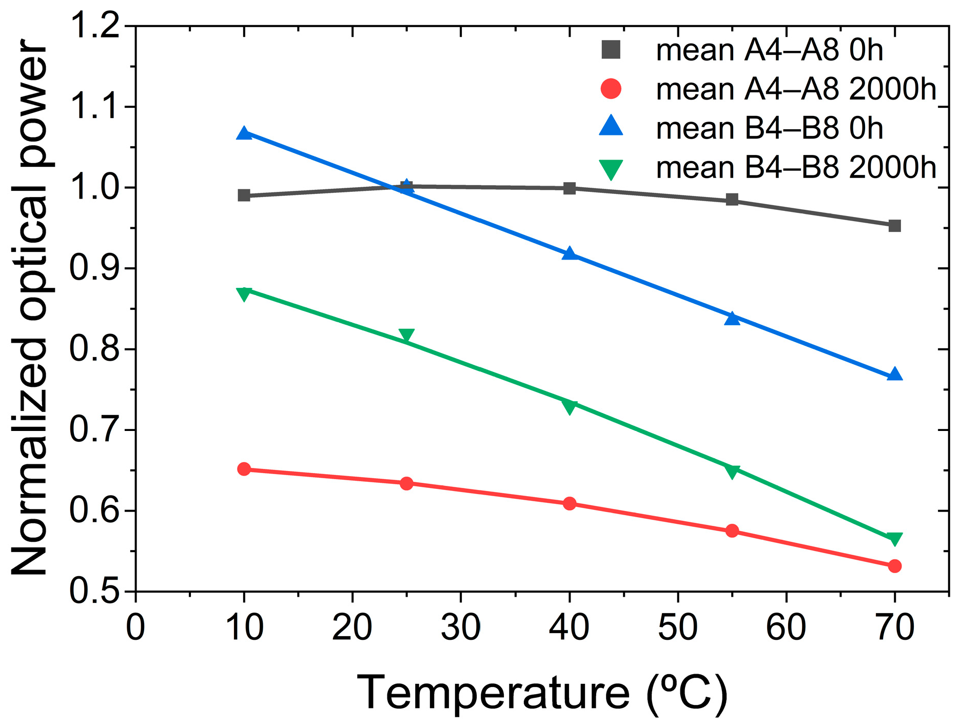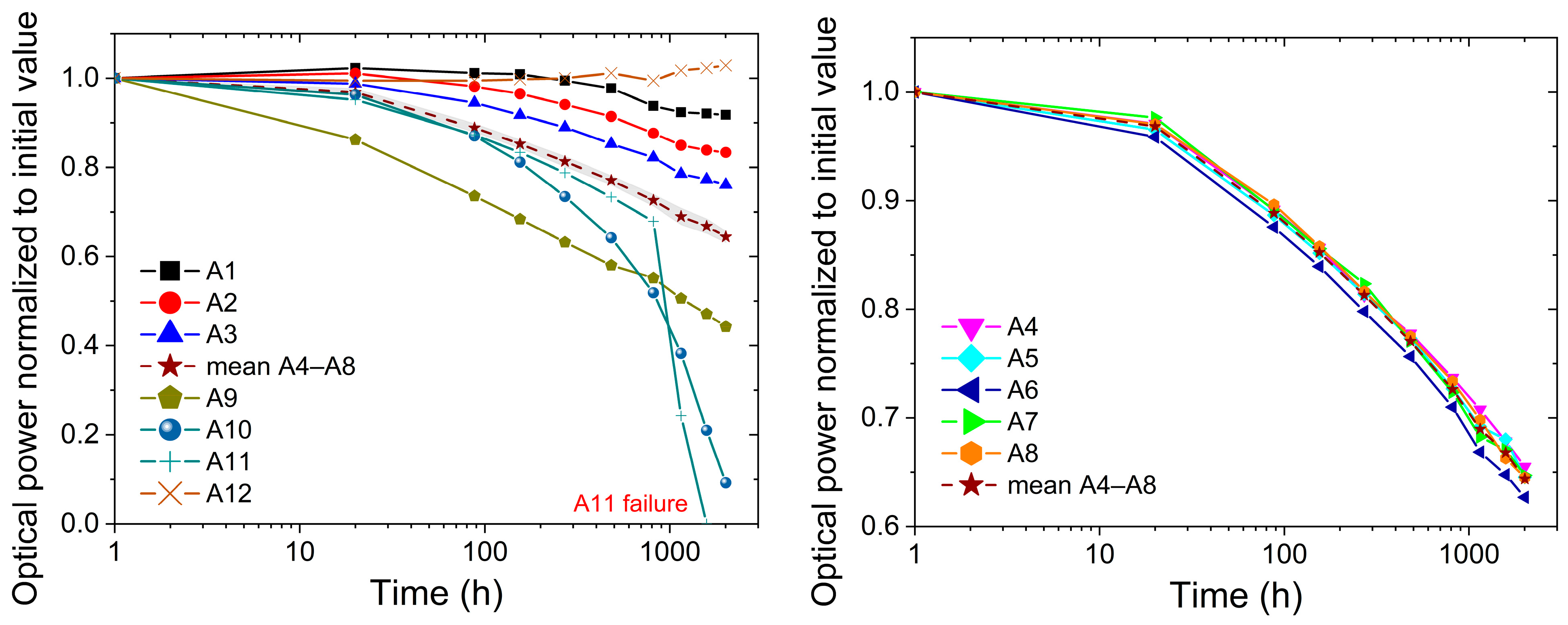 64]. However, given the limited number of samples per operating condition, these mechanisms should be interpreted as contributing factors rather than definitive causes. These effects correlate with the commonly observed two-phase degradation pattern: an initial rapid decline in optical power followed by a slower, sustained decay.