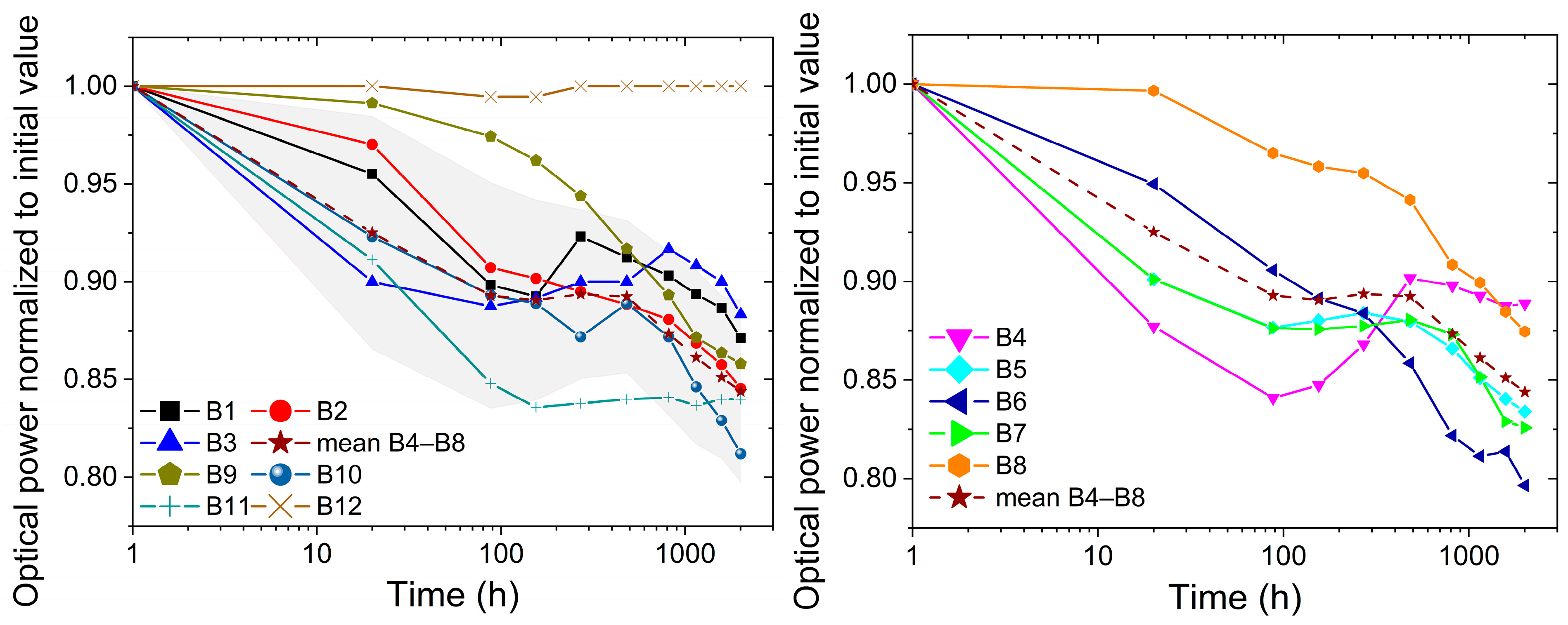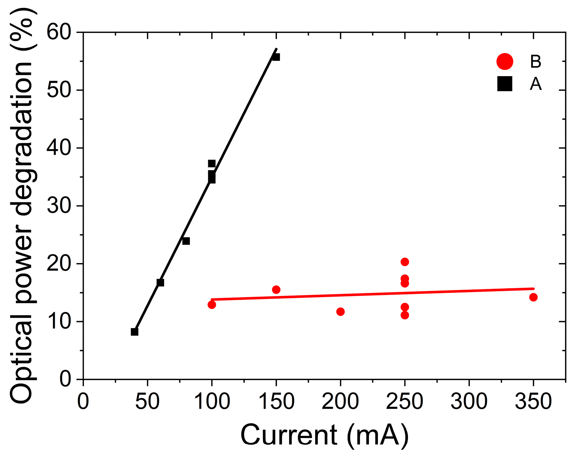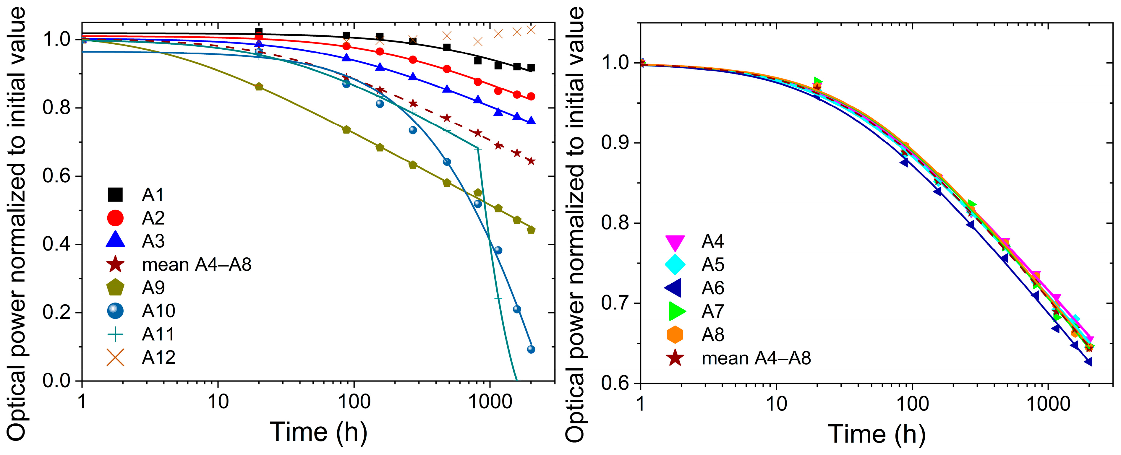 64]. However, given the limited number of samples per operating condition, these mechanisms should be interpreted as contributing factors rather than definitive causes. These effects correlate with the commonly observed two-phase degradation pattern: an initial rapid decline in optical power followed by a slower, sustained decay.