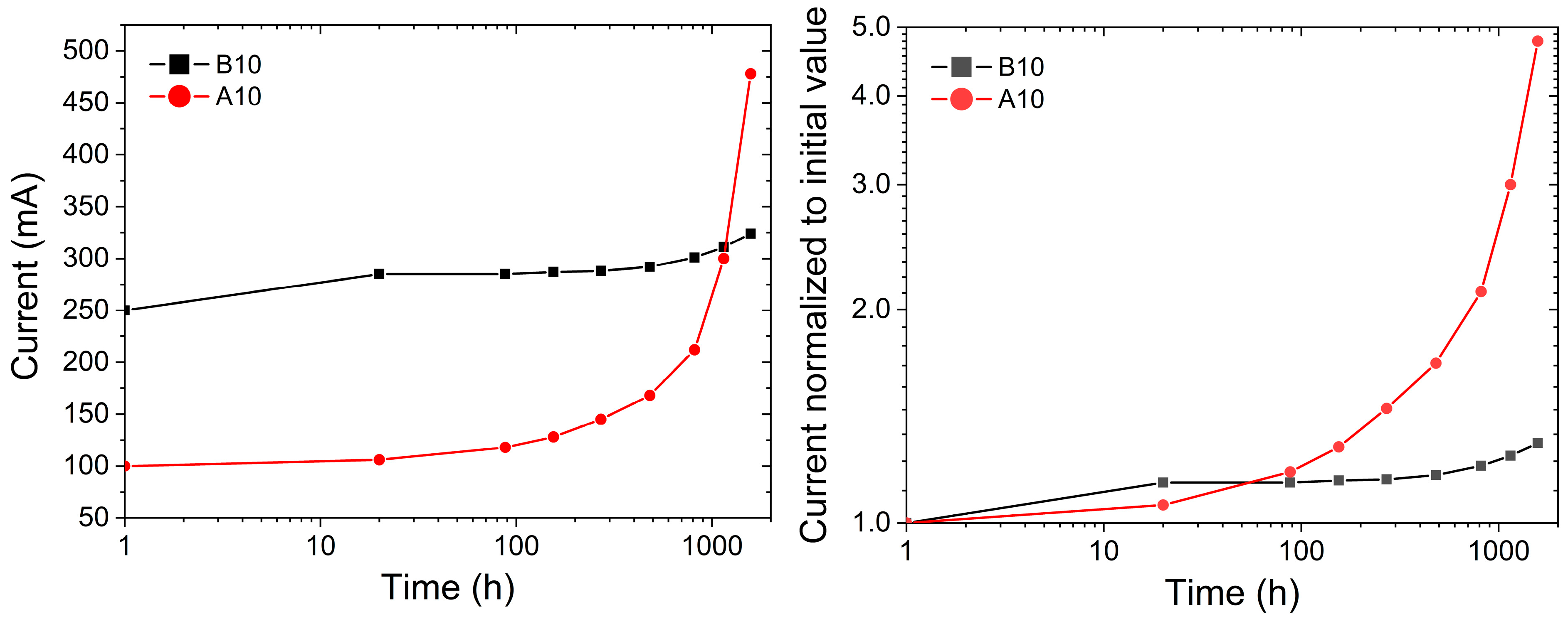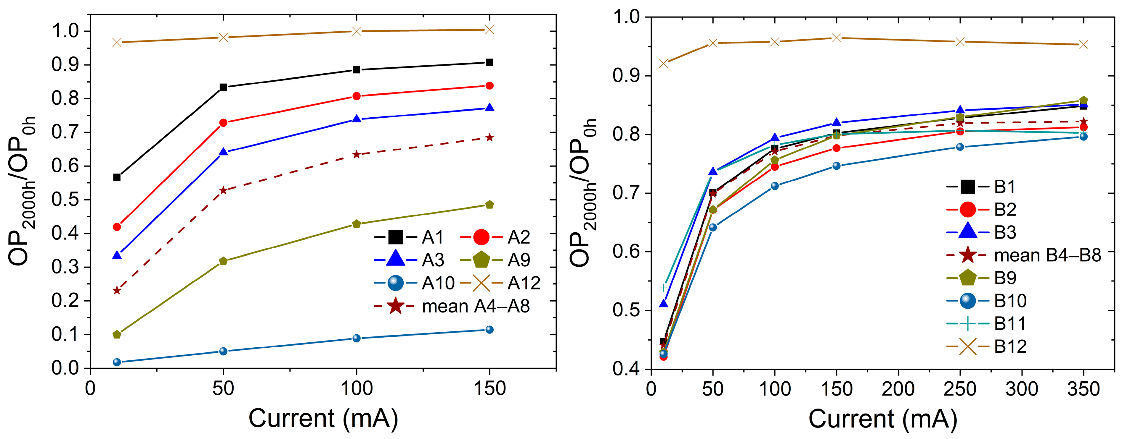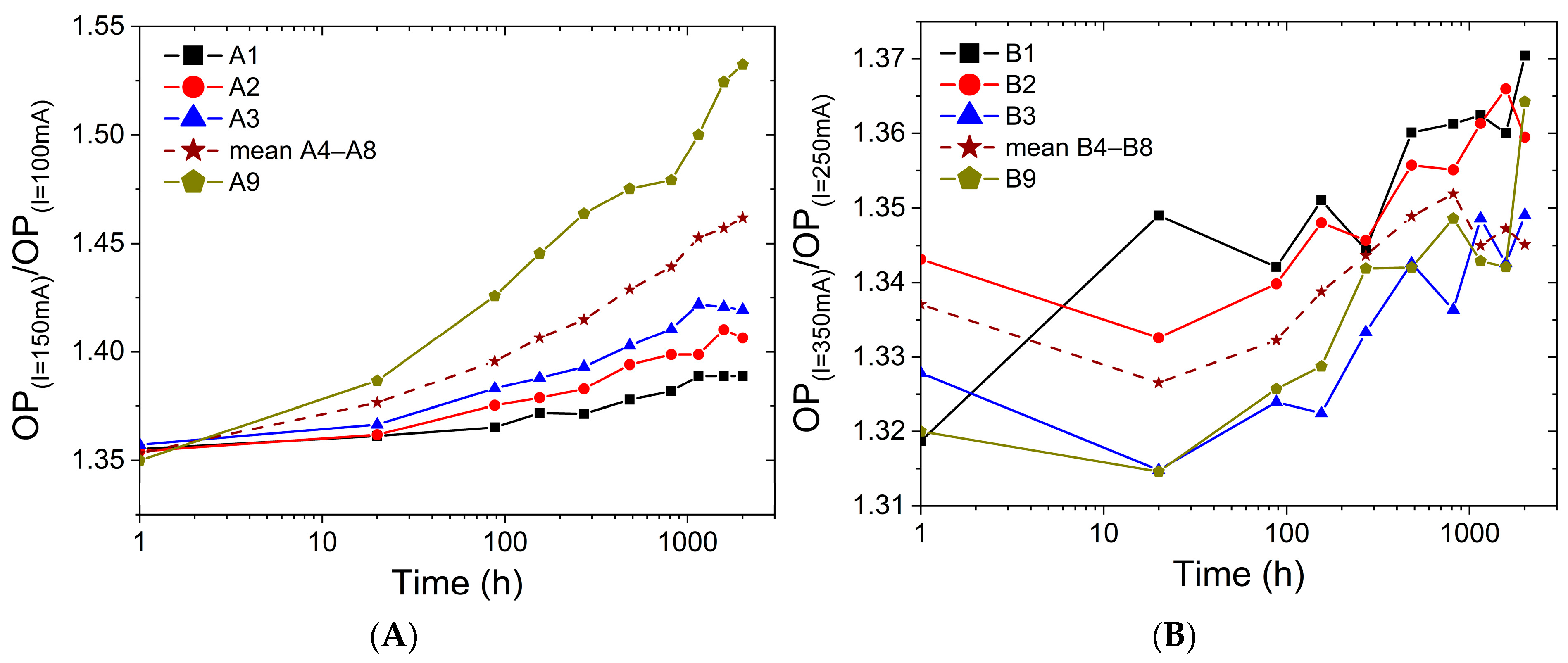 Figure 2). These observations, while device-specific, demonstrate the importance of extended ageing tests for capturing mid- and late-life degradation phenomena. This extended observation period underscores the necessity of long-term testing to obtain representative performance degradation profiles, particularly for devices intended for intermittent use or long service life.