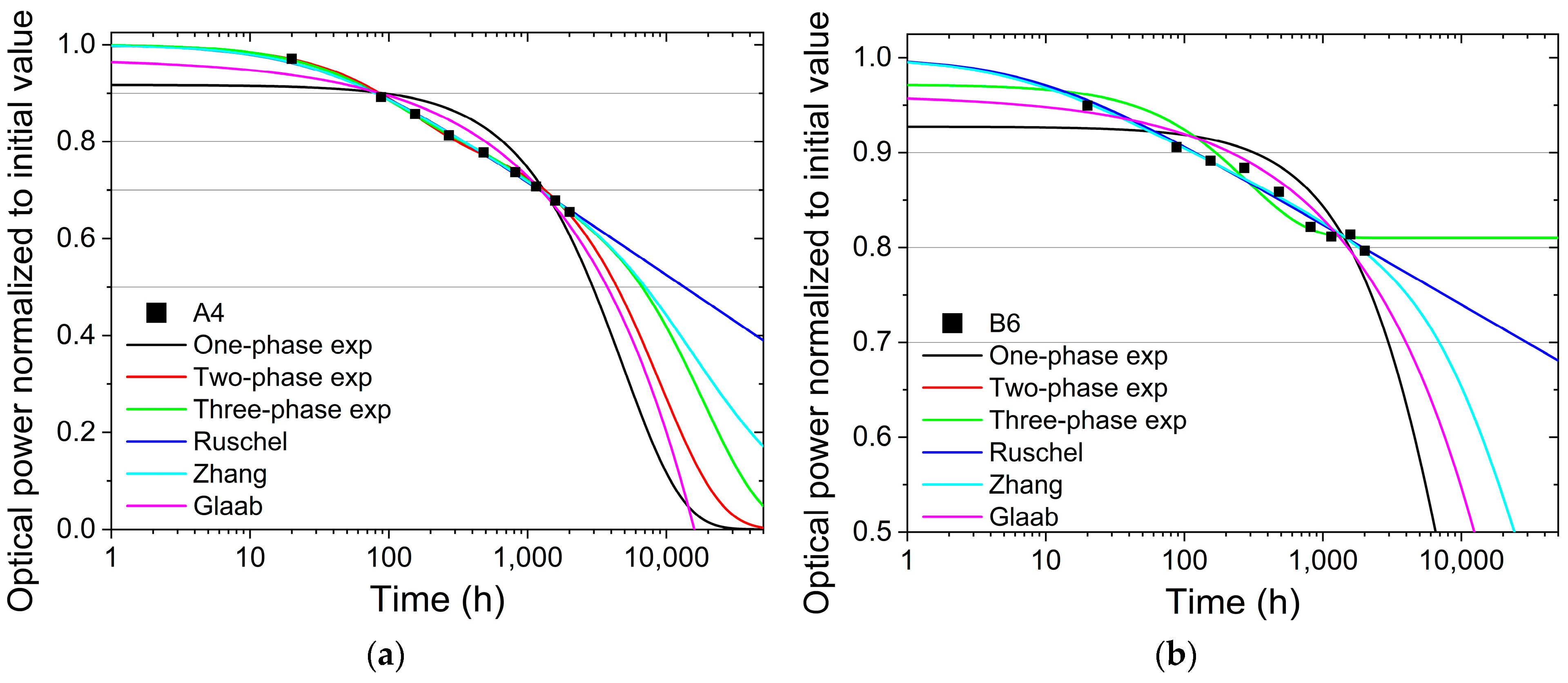 59] proposed a logarithmic optical decay model that showed strong agreement with experimental data and allowed for long-term power decay estimation without saturation artifacts. Glaab et al. [