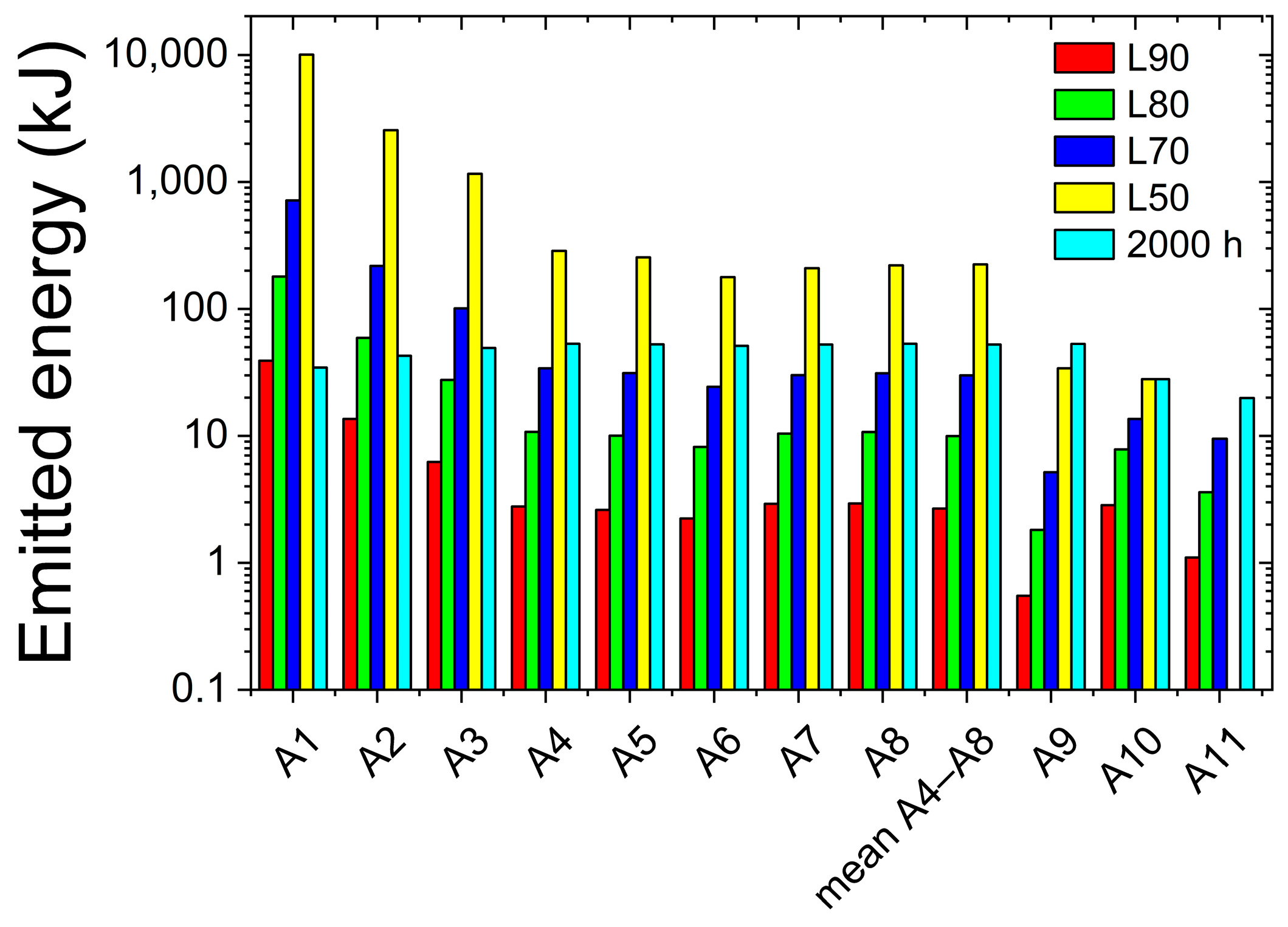 LED B11, operated under PWM conditions (Imax = 150 mA, 50% duty cycle, 10 kHz), exhibited an atypical degradation profile characterised by a pronounced initial optical power drop within the first ~200 h, followed by an extended period of near-stable output. Consequently, its degradation could not be adequately described by the Ruschel model, nor meaningfully compared with constant-current-operated devices based on average current alone. Accordingly, no L50–L90 lifetime projections were reported for B11, and the reported energy value corresponds to the experimentally accumulated output over the fixed 2000 h test duration rather than to an extrapolated lifetime metric.