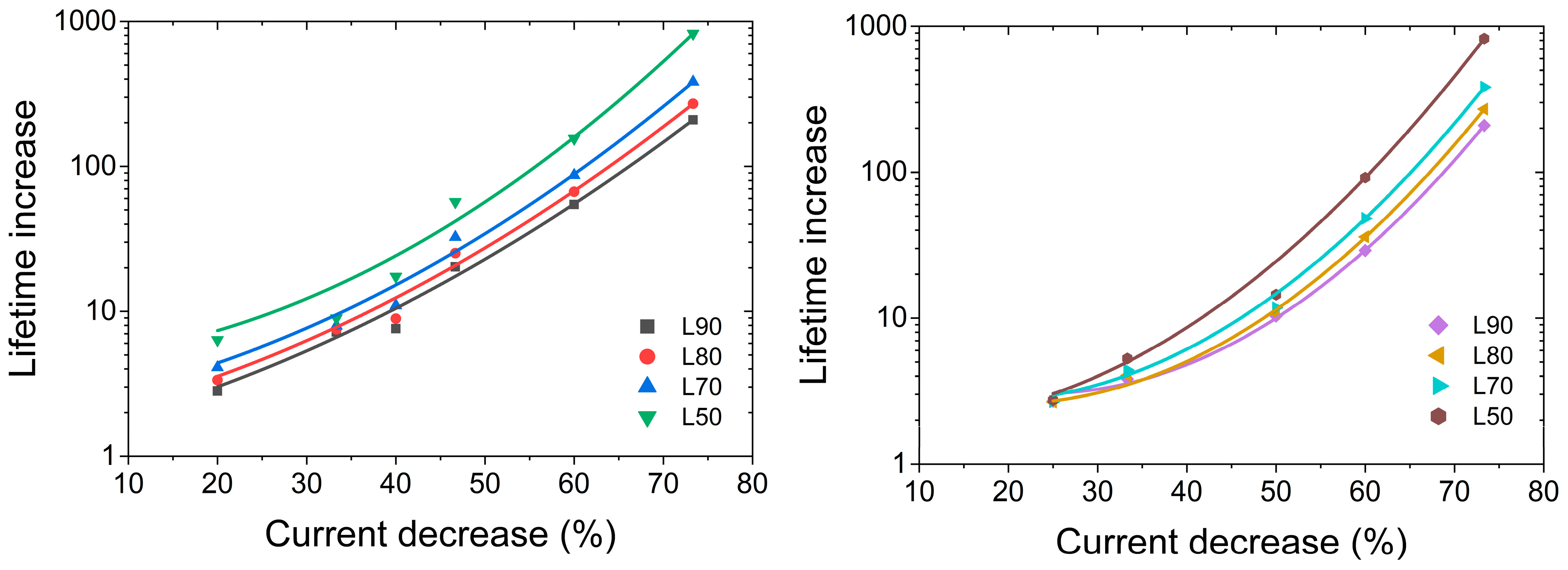 To facilitate direct comparison with previously reported current–lifetime relationships, an additional representation of lifetime as a function of the absolute operating current is provided in