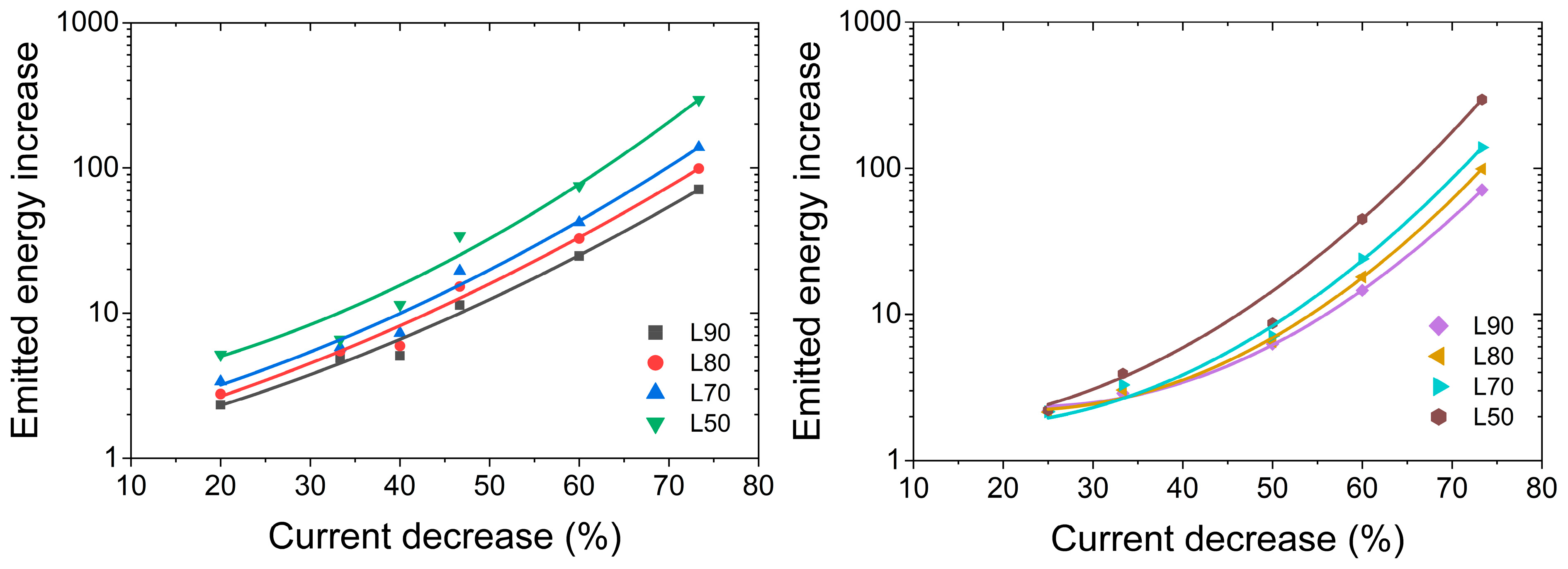 L80 point, a drop from 150 mA to 40 mA resulted in about a 100× increase in total energy emitted. Even a modest 20% reduction (100 mA → 80 mA) roughly 6 times lengthens the lifetime