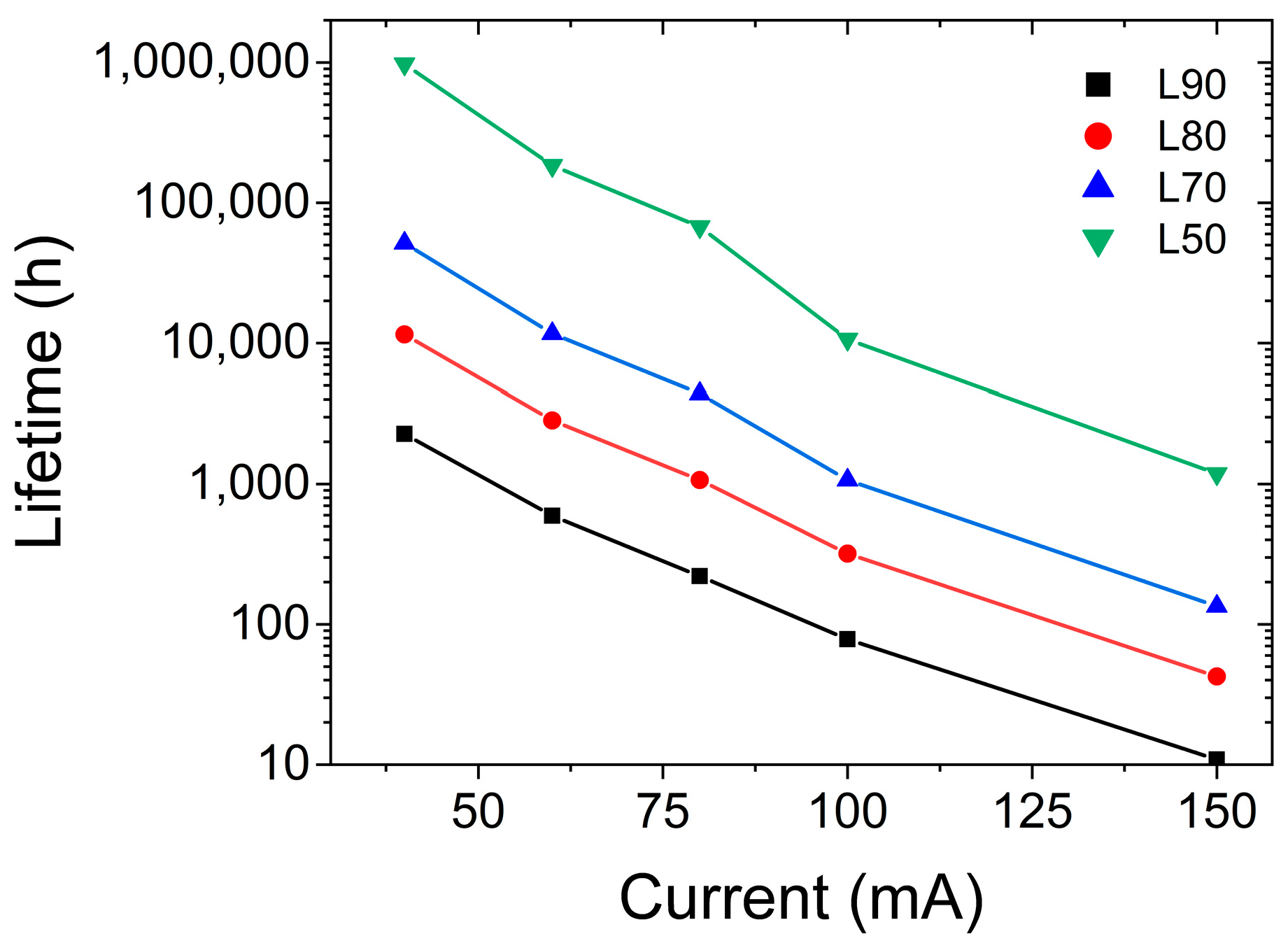 L70 lifetimes ranging from a few hundred to a few thousand hours at nominal operating current [