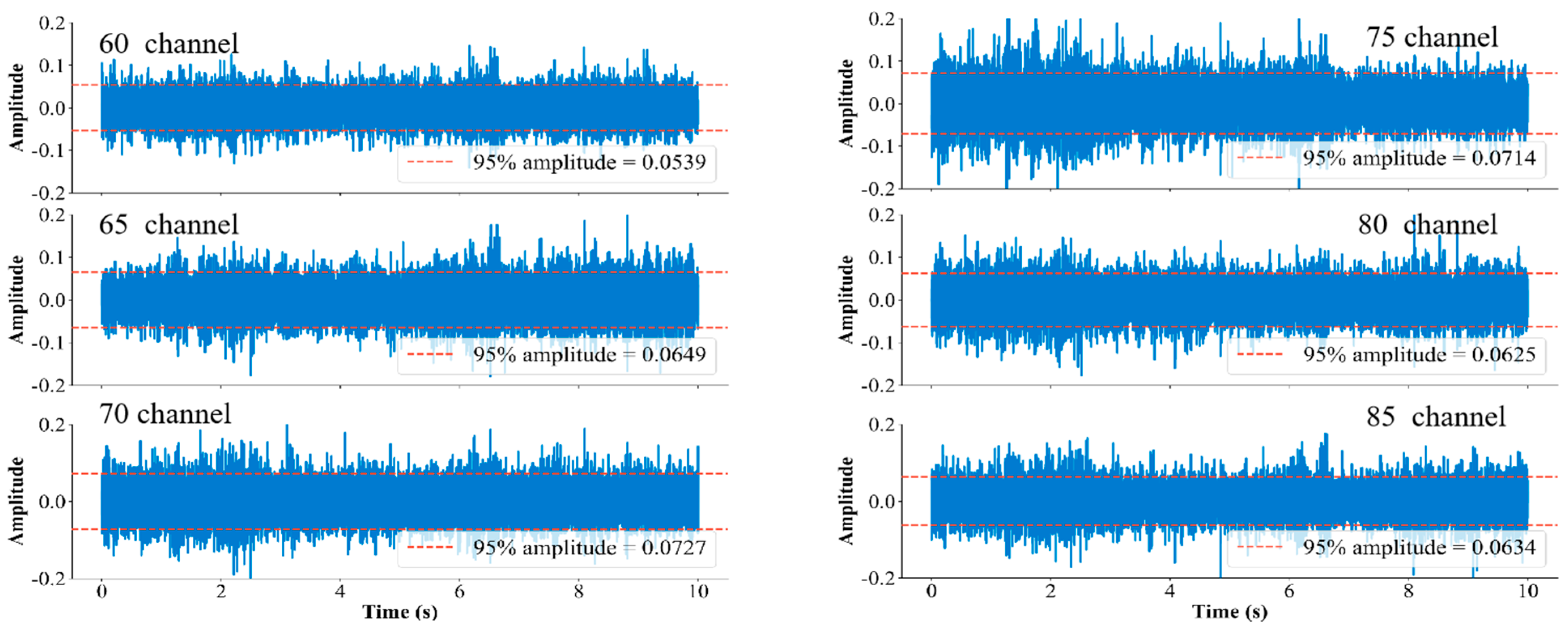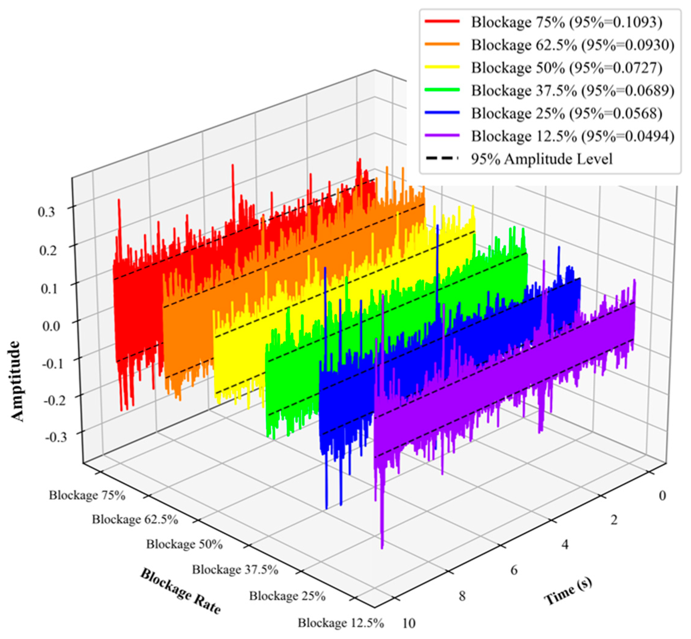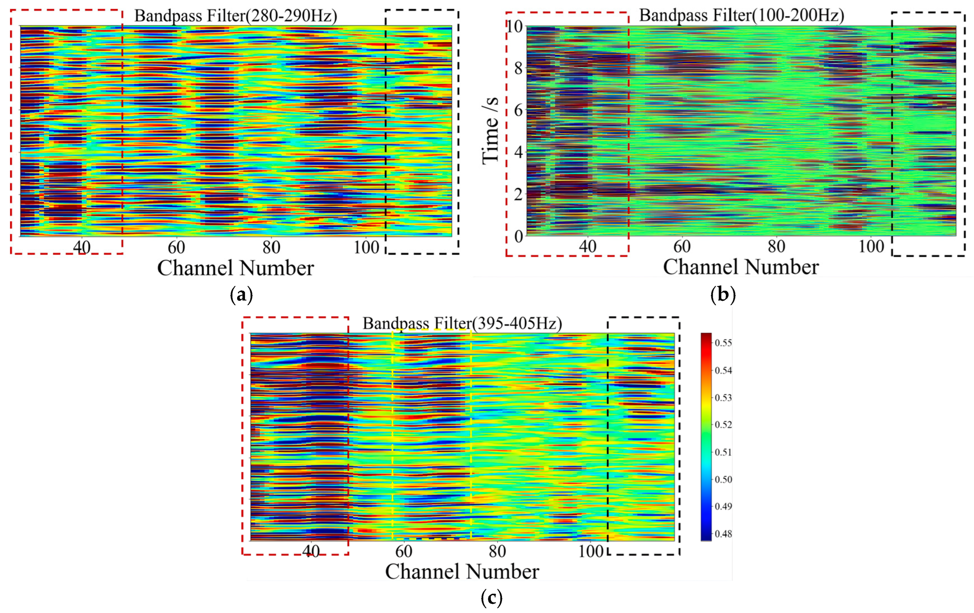 - The 395–405 Hz band served as the core frequency band for the blockage region under the 50% blockage condition. Within this band, only the blockage region (channels 70–75) exhibited strong, temporally continuous high-amplitude signals, showing a distinct energy difference compared to unobstructed regions. This clear contrast in acoustic intensity allows for reliable discrimination between blocked and unblocked channel areas.