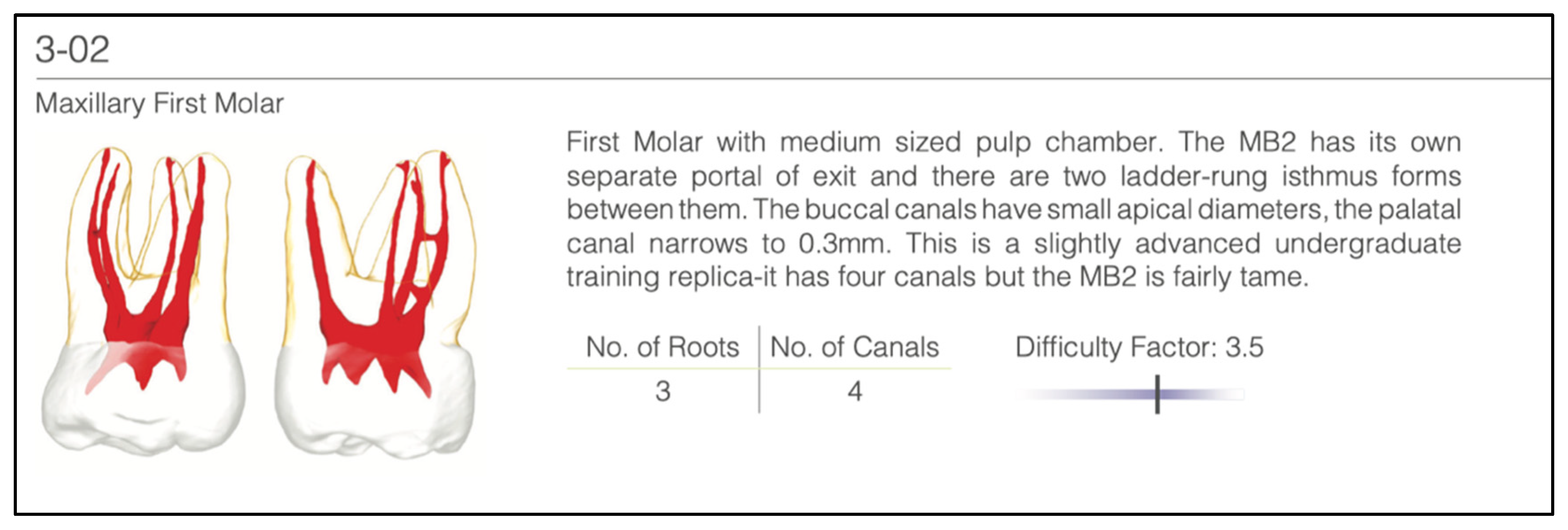 - Dental Engineering Laboratories. TrueTooth® Endodontic Training Replicas-Product Catalogue; Dental Engineering Laboratories: Santa Barbara, CA, USA, 2004; Available online: https://delendo.com/ (accessed on 22 December 2025).