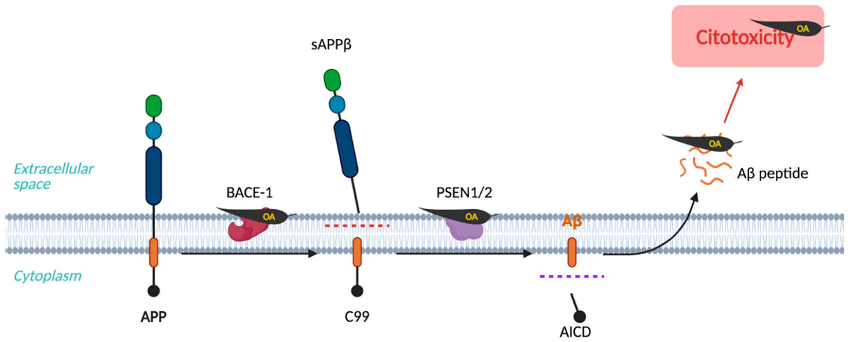 | OA and nitrogen-substituted derivatives | Significant reduction in APP expression; inhibition of PSEN1 and PSEN2 | LPS-stimulated SH-SY5Y neuroblastoma cells | [23] |