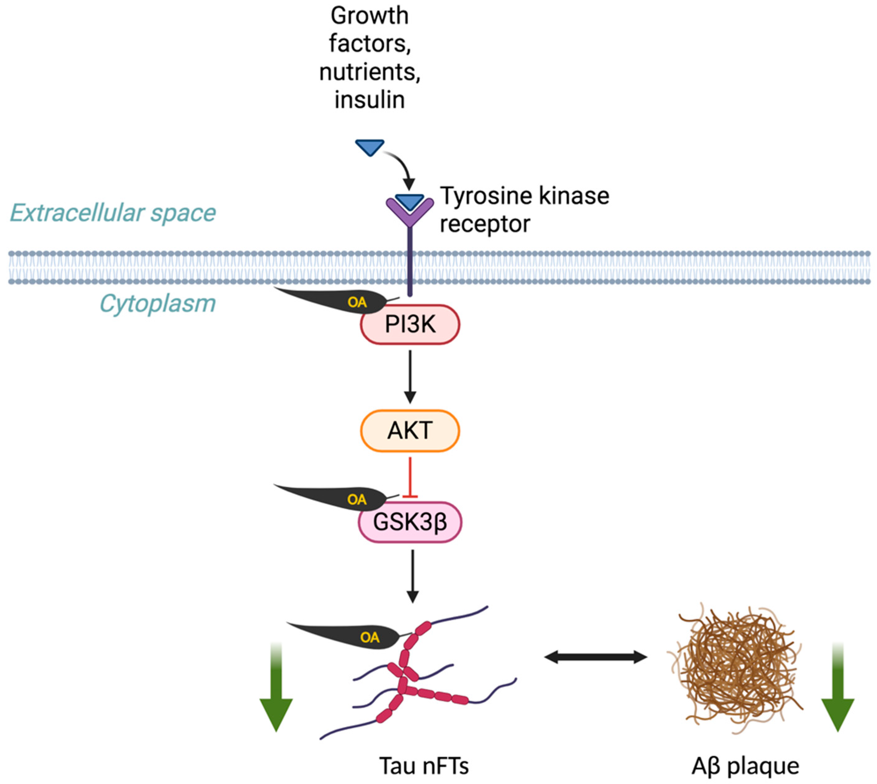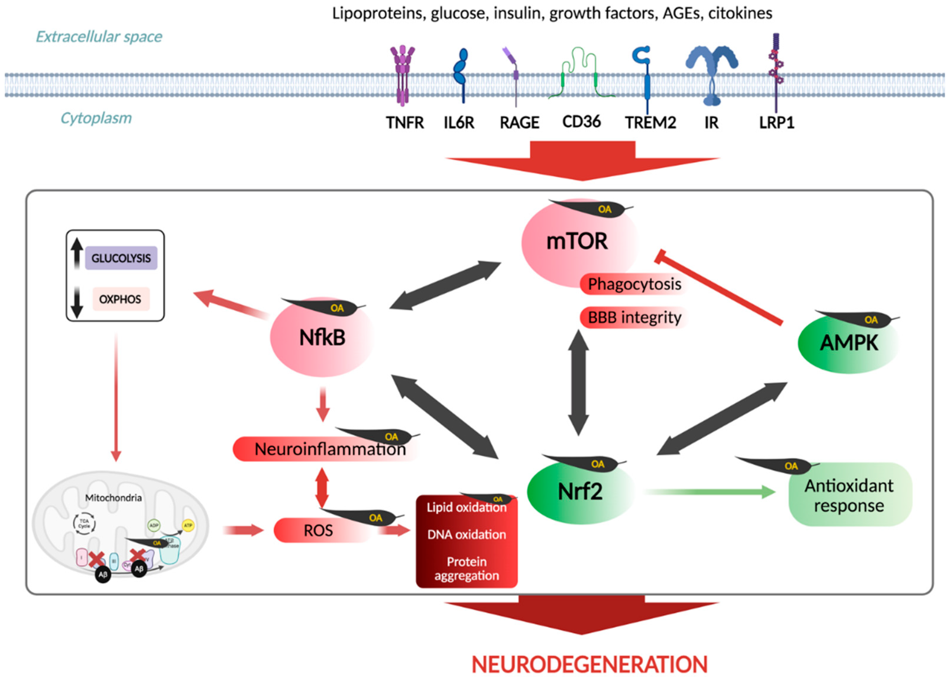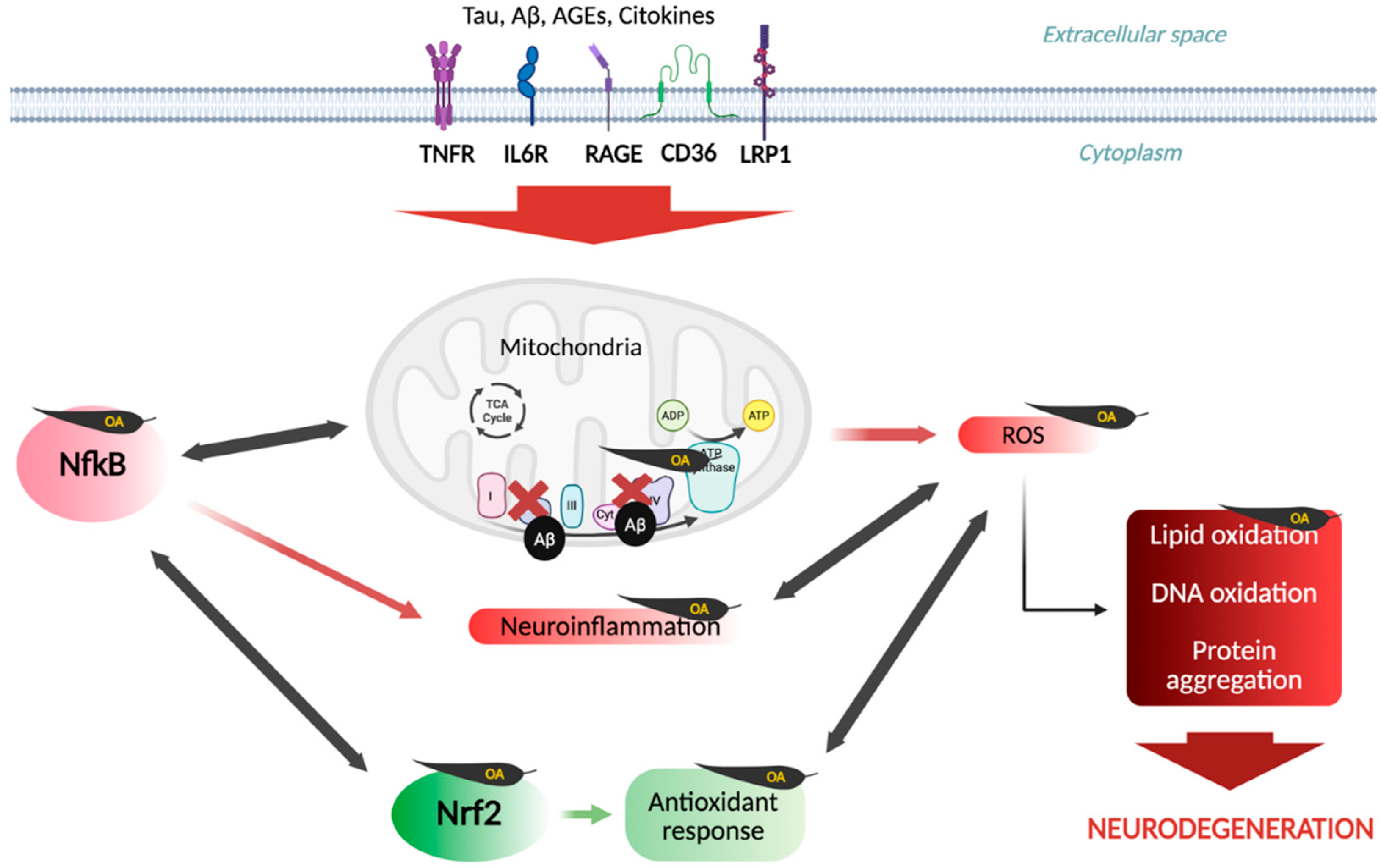 | OA (21.6 mg/kg) | Improved performance in maze and spatial tests; preserved neuronal and mitochondrial morphology; restored NMDAR2B, CaMKII, and PKC levels | Rats with intracerebroventricular (ICV) injections of Aβ | [34] |