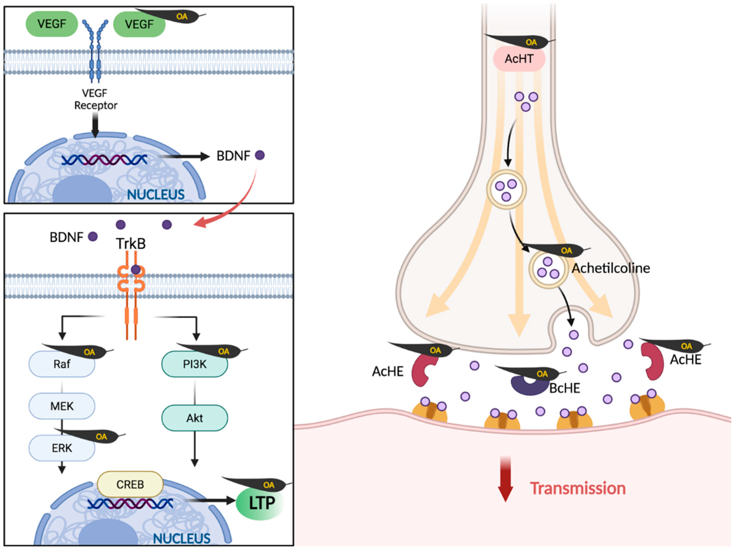 | OA (0.625, 1.25, 2.5, or 5 mg/kg in ICR mice), OA 30 μM in primary neuron culture | Reversal of ACh deficits via TrkB receptor activation; increased BDNF expression and induction of LTP via MAPK ERK1/2 pathway | Male ICR mice scopolamine-induced cognitive impairment. Primary neuron culture from Sprague-Dawley | [75] |