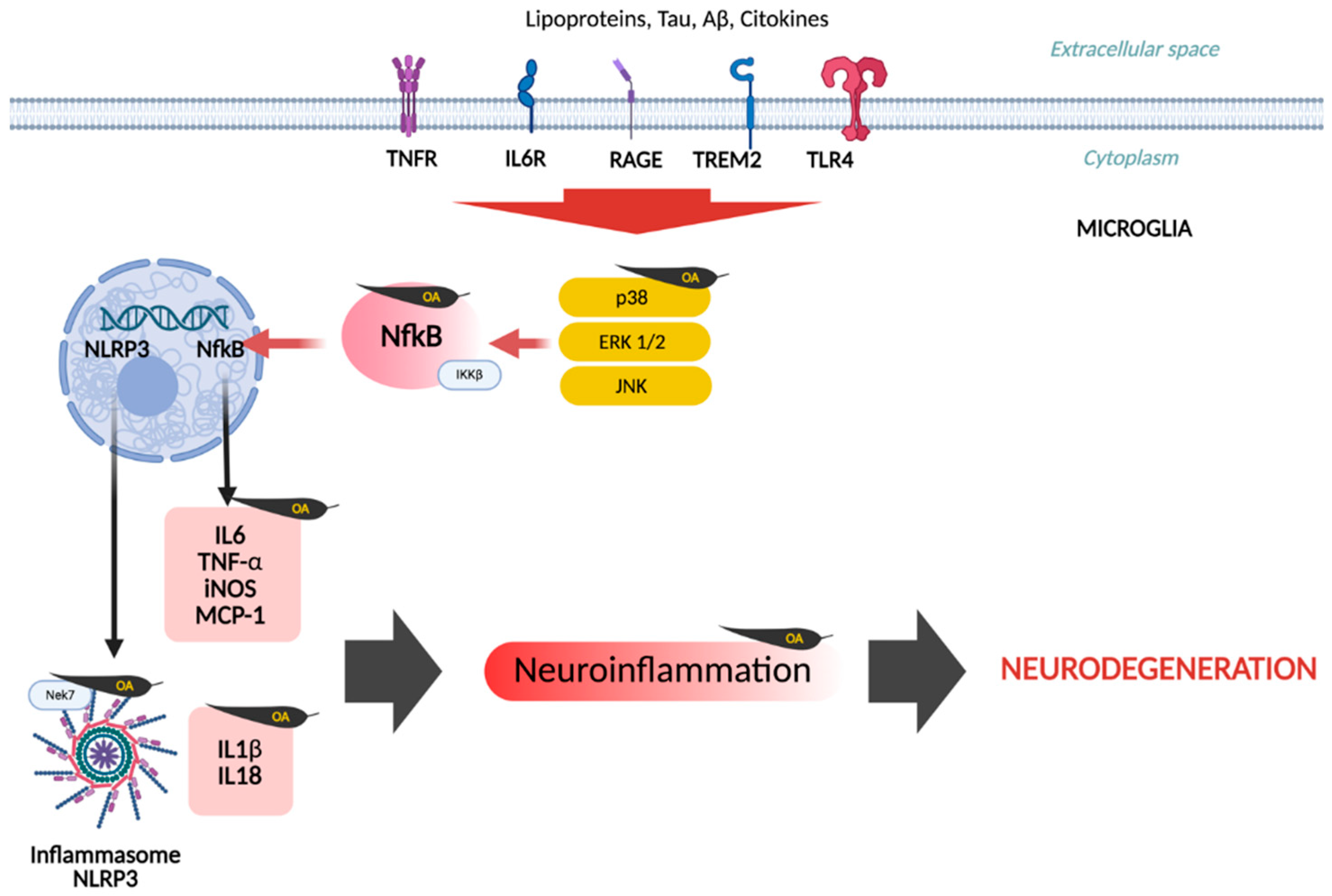| OA and N-substituted OA derivatives | Reduced TNF-α, IL-6, IL-17, IBA1, and iNOS expression; inhibited NF-κB signaling pathway. | THP-1 monocytes and RAW 264.7 macrophages | [23] |