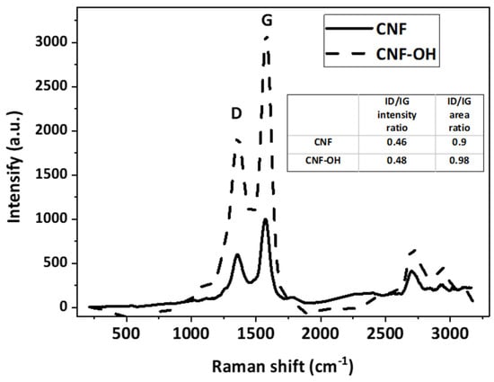 Raman spectroscopy was performed on the modified CNF to confirm the chemical modification (Figure 1). Raman spectra of the functionalized graphene were recorded on a DXR Raman Microscope (manufactured by Thermo Electron Scientific Instruments LLC, Madison, WI, USA) by a 473 nm laser line. The “10×” objective was used to focus the Raman microscope. The rheological behavior of the solutions was analyzed on an Anton Paar MCR 702 rheometer (Anton Paar, Graz, Austria) using the cone-plane method. The analysis revealed that the intensity ratio between the D band (ID = 1356 cm−1) and G band (IG = 1575 cm−1) increases from 0.46 to 0.48, confirming controlled functionalization of CNF-OH, consistent with the targeted low degree of surface modification [27,28].