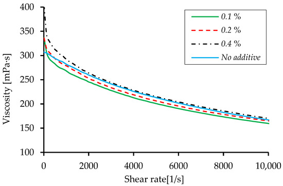 The use of water as a solvent offers a greater economic advantage. Polyvinyl alcohol offers several advantages: it is biodegradable and biocompatible (it has a low protein adhesion and toxicity); it is soluble in water, colorless and odorless; and it is widely used, making it easily accessible. The nanofiller’s effect on solution viscosity depends on nanotube shape, size, temperature at use, concentration and other specific properties. CNF-OH were used in PVA-S to obtain three different concentrations: 0.1%, 0.2% and 0.4% (weight %). The viscosity behavior of the PVA-S is influenced by the presence of both intermolecular and intramolecular hydrogen bonds [29,30]. The hydrolysis degree, concentration and molecular weight critically affect the rheological properties of PVA-S [31]. During the preparation of the CNF-OH nanofiller dispersion in PVA-S, a high shear force was applied, which makes it possible to obtain a morphology involving the intercalation of CNF-OH between the polyvinyl alcohol polymer chains. The modification of CNF with functional groups such as -OH and -COOH permits the formation of hydrogen bonds with the polyvinyl alcohol polymer chains and facilitates dispersion in water. The application of a high shear rate to the PVA-S with the nanofiller CNF-OH results in a decrease in viscosity with shear rate. This behavior is specific for non-Newtonian fluids [32], with the dispersion presenting pseudoplastic behavior. Many gels and colloids are pseudoplastic thixotropic materials, stable at rest but fluid when agitated, exhibiting a reversible gel–sol transformation phenomenon. Fluid thixotropy is not of interest for the current study because of the short shearing period.