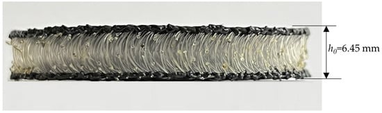 The three-dimensional textiles in dry conditions have a proven capacity to damp impact energy [13,33,34], and studies show that this capacity is significantly improved when imbibed with liquids [13]. A single type of porous material was used during experiments, a three-dimensional textile (3D Spacer, produced by Heathcoat Fabrics, Tiverton, UK) (Figure 3). The material is warp-knitted with a structure of vertical monofilament yarns that joins together two faces at a certain distance. Their internal structure was studied by Lupu et al. [34,35], revealing that the diameter of the vertical yarn is d = 150 μm. The two sides are made of the same material but woven differently, and one of the sides has large holes. Generally, the entire structure stability and its compression response are influenced by the distance between the two faces. The total thickness of this material is h0 = 6.45 mm, with the faces having different thickness: 0.85 mm and 0.645 mm.