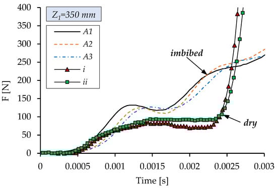 First, the variation in force over time was compared between the dry material (tests i, ii for Z1 = 350 mm and iii, iv for Z2 = 200 mm) and imbibed material with a solution of water and 9% PVA. Figure 6 presents force variation during tests using a drop height Z1 = 350 mm and Z1 = 200 mm. The tests presented for Z1 and Z2 are annotated with A and B, respectively. A minimum of three tests, each performed on a new sample, were performed to evaluate the reproducibility of the results. With a corresponding impact energy E1 = 1.38 J, the force recorded for dry material is significantly higher, 4 times greater. The dry material’s steep impact-force variation suggests that it was compressed enough to reach densification (“bottoming up” [37]). A force reduction was also observed for the imbibed material for Z2 = 200 mm, with a corresponding impact energy of E2 = 0.79 J.