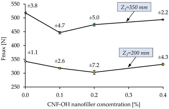 The values of the maximum force with respect to each CNF-OH nanofiller concentration are presented in Figure 8 in average form (for 3 tests) with standard deviation included. The average standard deviation calculated for maximum force is less than 5 N for Z1 = 350 mm and less than 8 N for Z2 = 200 mm. The results presented in this figure show a 15% reduction for 0.1% CNF-OH nanofiller concentration for Z1= 350 mm and a 7% reduction at Z2= 200 mm, compared to the force generated when using the base solution. Better performance was observed for Z2= 200 mm drop height when using 0.2% CNF-OH nanofiller concentration with an important reduction of 14%. Based on these results the optimal nanofiller concentration for maximum damping effect is around 0.1%.