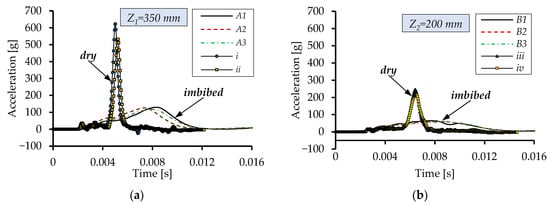 Impactor acceleration variation during impact on dry and imbibed (PVA-S) 3D Spacer sample for different drop heights: (a) Z1 = 350 mm. (b) Z2 = 200 mm.