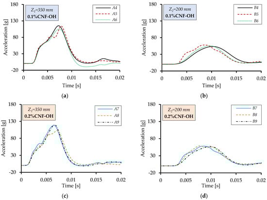 Figure 10 illustrates the acceleration variation for tests with different nanofiller concentrations. The comparison reveals minor differences, as expected given that acceleration measured on the falling body reflects only post-contact displacement.