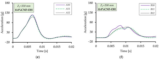 Impactor acceleration variation during impact on imbibed 3D Spacer (PVA-S CNF-OH): (a) Z1 = 350 mm: A4, A5, A6 → 0.1%. (b) Z2 = 200 mm: B4, B5, B6 → 0.1%. (c) Z1 = 350 mm: A7, A8, A9 → 0.2%. (d) Z2 = 200 mm: B7, B8, B9 → 0.2%. (e) Z1 = 350 mm: A10, A11, A12 → 0.4%. (f) Z2 = 200 mm: B10, B11, B12 → 0.4%.