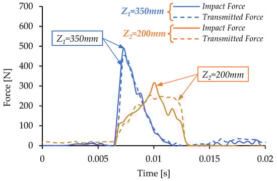 Comparison between impact and transmitted force for imbibed 3D Spacer (water + 9% APV + 0.4 CNF-OH) from Z1 = 350 mm and Z2 = 200 mm, with an impactor of 0.402 kg.
