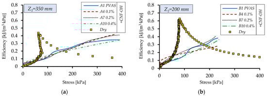 Figure 13 shows the specific energy absorption for the base solution and the different nanofiller concentrations, while Figure 14 presents the corresponding efficiencies. Absorbed energy increases steadily with stress, and in tests where the stress reaches a plateau, a more pronounced rise is observed. Compared with the dry sample, the behavior is fundamentally different. For the dry material, absorbed energy and efficiency rise sharply when stress remains nearly constant in the plateau region (Figure 12). Once the stress begins to increase again, absorbed energy levels off and efficiency drops, indicating the onset of densification.