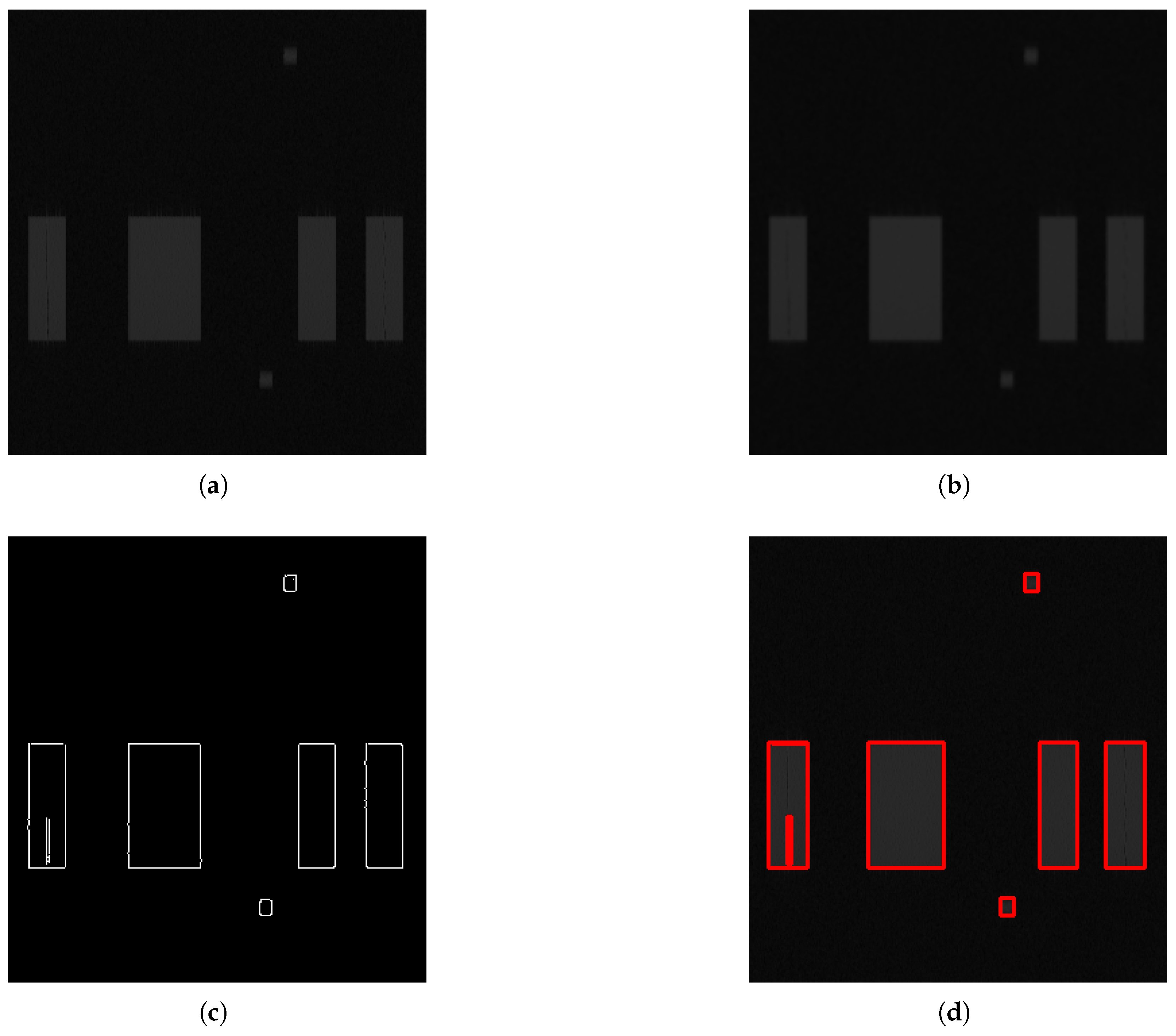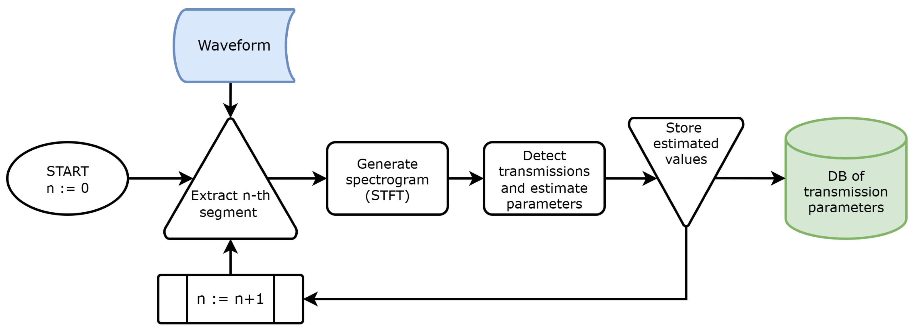 Figure 3. First, the spectrogram is normalized and converted to a grayscale image. This involves mapping the magnitude spectrogram values proportionally onto an array of bytes ranging from 0 (black, representing the lowest spectrogram value) to 255 (white, representing the highest value). Next, a two-dimensional convolution with a 5 px by 5 px Gaussian filter is applied to slightly blur the image. This blurring acts as a low-pass filter, reducing noise variance while preserving transitions related to transmitter activity. The blurred image is then processed using an edge detection function that employs the Canny algorithm. The Canny algorithm is a widely used method for detecting vertical, horizontal, and diagonal edges in images, making it suitable for this application. Since the Canny algorithm implements hysteresis thresholding, two thresholds must be specified; in this case, they were set to 10 and 20, respectively. Subsequently, contours—defined as closed shapes bounded by multiple edges—are detected throughout the image. Each contour is then enclosed within a bounding rectangle, the interior of which is assumed to represent a region with active transmission. All the aforementioned processing steps are implemented using the OpenCV library with the respective functions: GaussianBlur(), Canny(), findContours(), and boundingRect(). Example results are presented in
