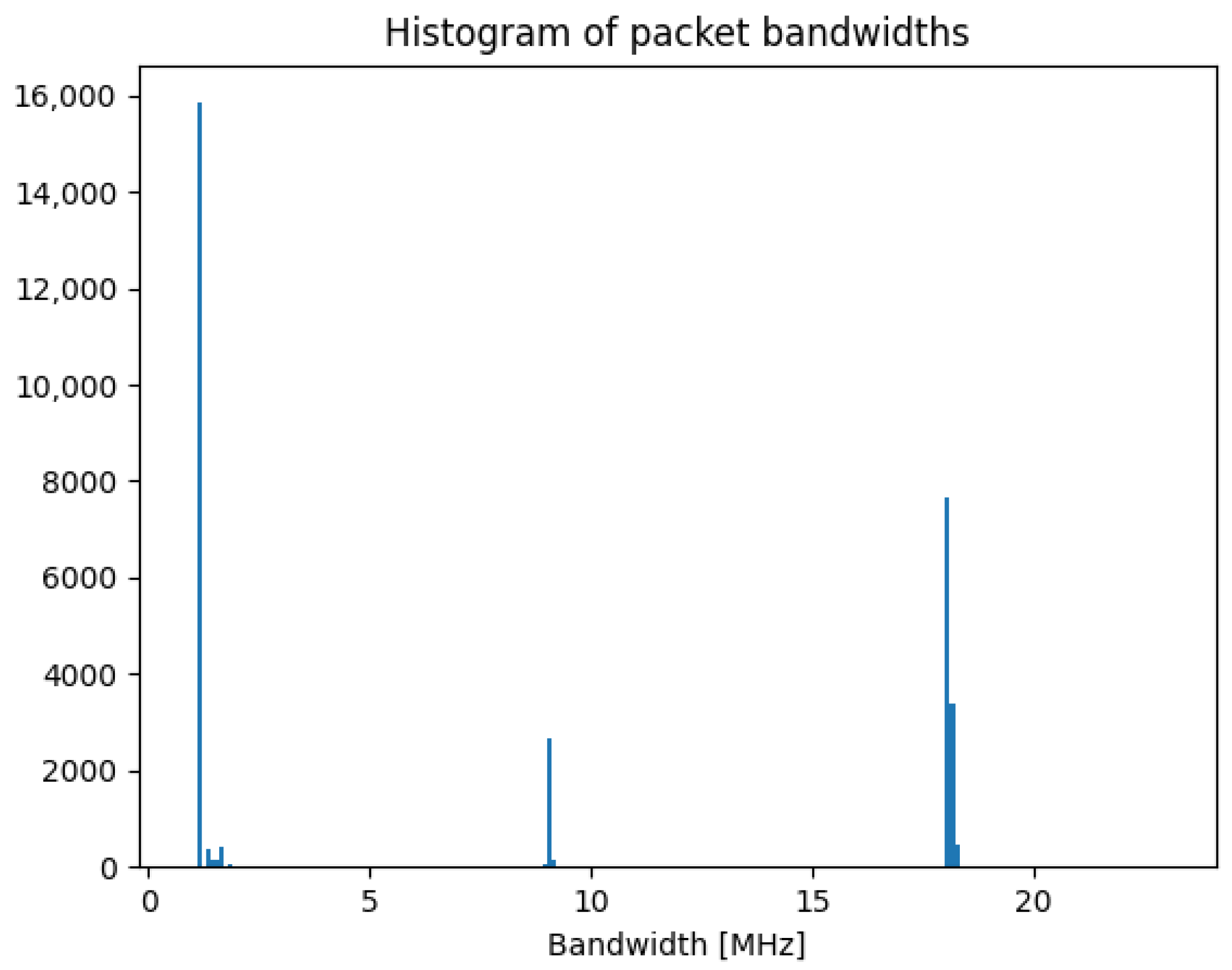 As mentioned earlier, the analysis began by estimating the distribution of observed transmission bandwidths. For each UAV, histograms were generated using all captured waveforms (i.e., without distinguishing between flight modes or frequency bands). An example of such a histogram, obtained for the DJI Mini 2, is shown in