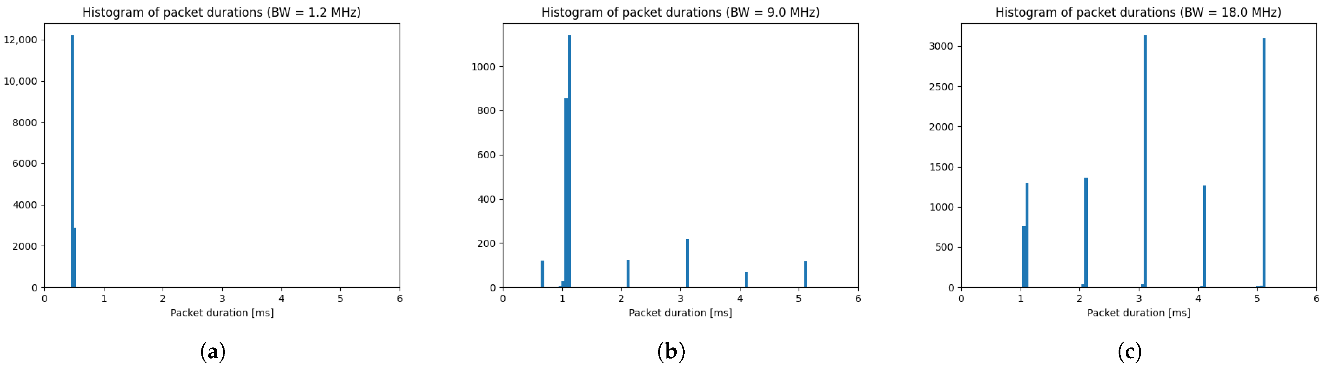 Although bandwidth-related statistics may be useful for classifying UAV manufacturers, they are insufficient to distinguish between specific models, as some models—particularly those from DJI—may use the same set of bandwidths. Therefore, further analysis of transmission durations is necessary. The durations were analyzed independently for each identified bandwidth of a particular UAV model. The corresponding histograms for the DJI Mini 2 are shown in