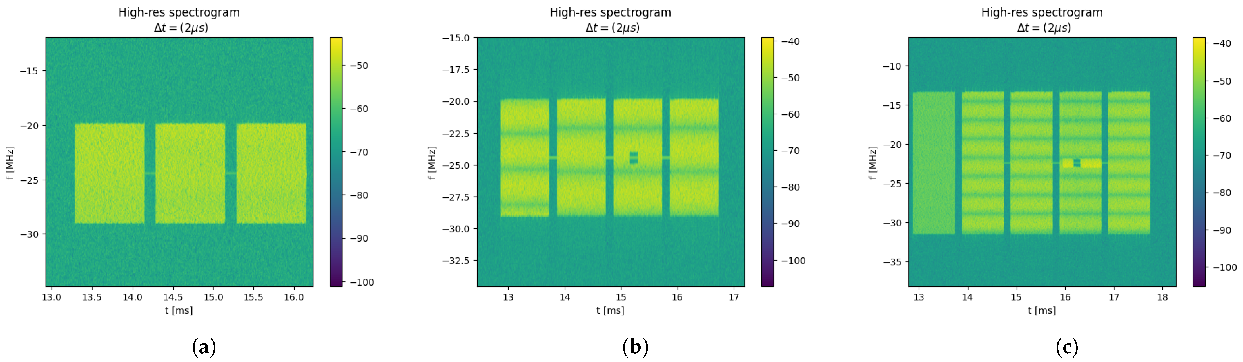 Figure 7b,c, where a window with muted frequency components appears in one of the packets near the center frequency. Similarly, many DJI transmissions contain symbols modulated with Zadoff–Chu sequences, producing diagonal lines or checkerboard-like patterns in the spectrogram. Classification confidence may be enhanced by integrating the recognition of these patterns with the approach proposed in this paper.