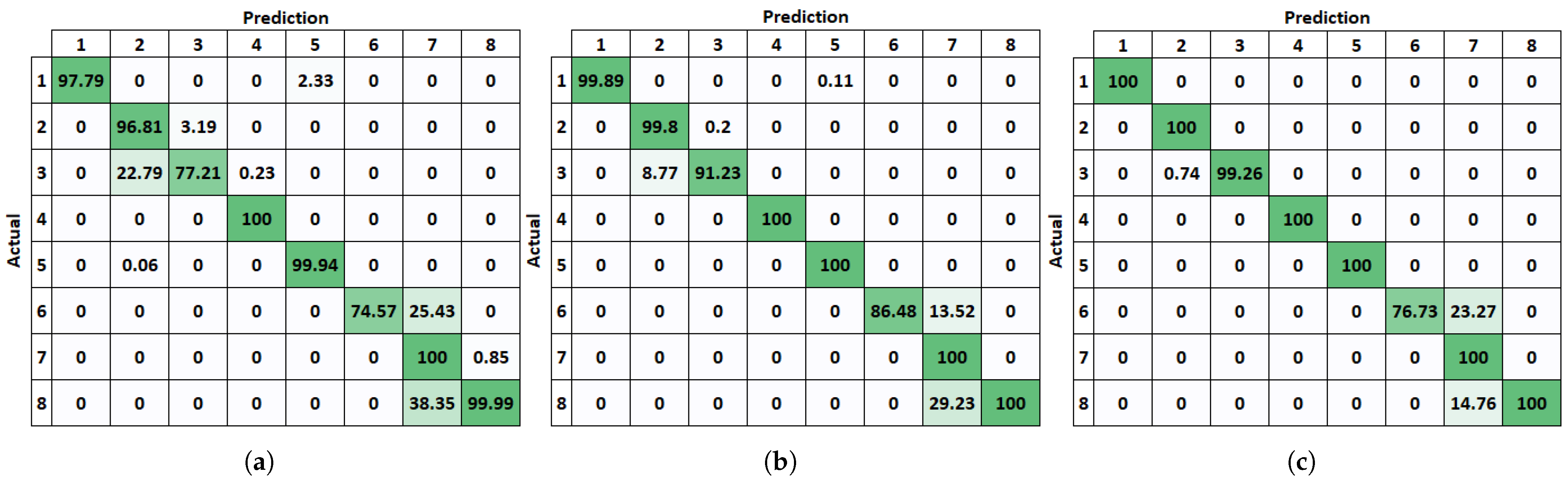 The performance of the classifier can be evaluated using the confusion matrix. This matrix illustrates the relationship between the actual classes (UAV models) and the classification predictions obtained from limited data sets. Three confusion matrices are provided, each corresponding to a different amount of data used for classification. A set of N (100, 300, or 1000) bandwidth–duration estimates was input to the classifier. The classification was repeated 10,000 times, each time with a different randomly selected set of estimates. The corresponding confusion matrices are shown in