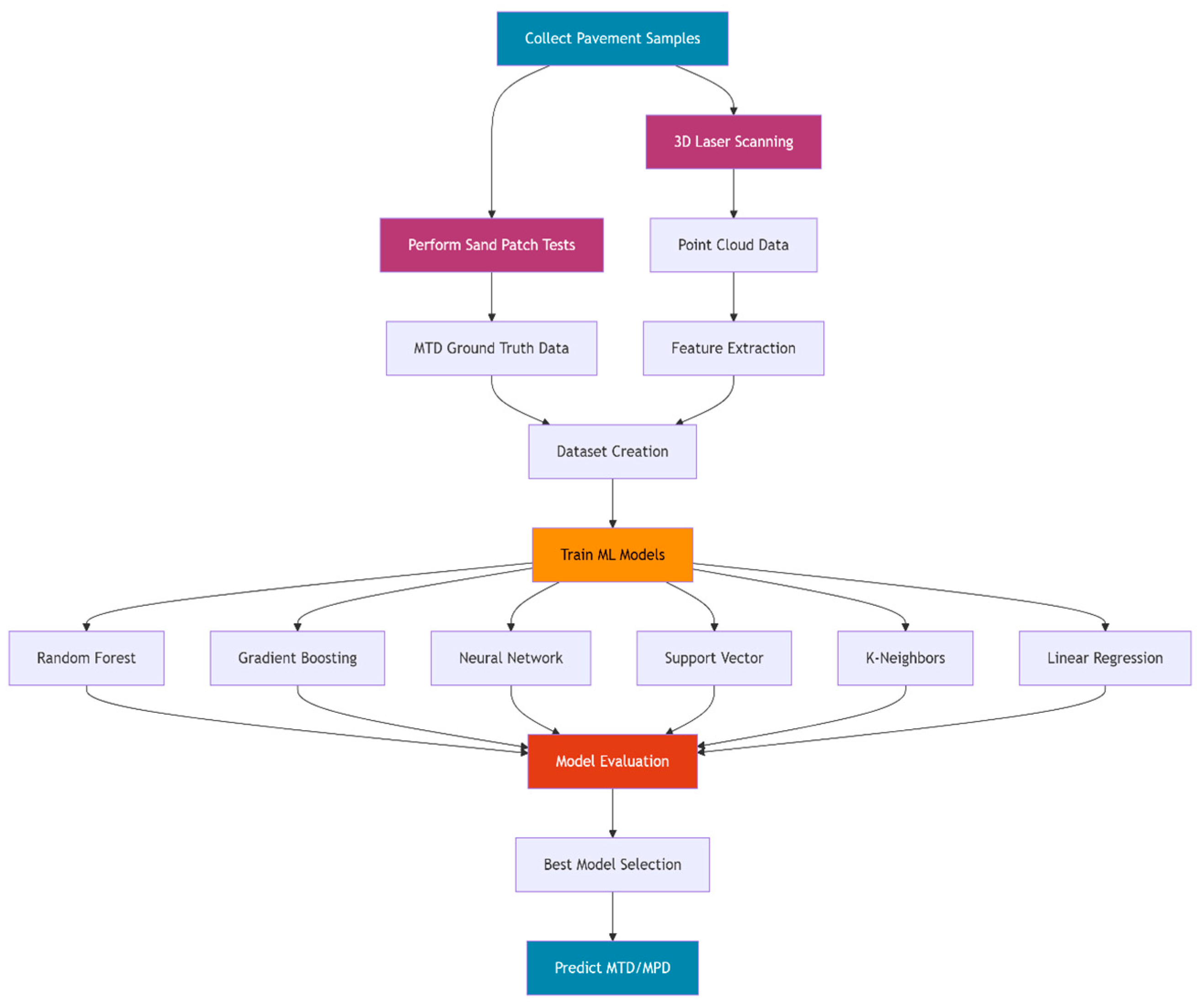 This research employed a comprehensive experimental framework integrating traditional pavement texture measurement, 3D laser scanning, and machine learning algorithms, as shown in