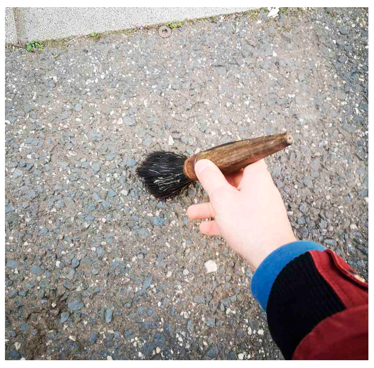 The pavement surface to be measured was inspected, and a dry homogeneous area was selected, free of any specific deviations such as cracks or gaps. The surface was thoroughly cleaned, first with a stiff-wire brush and then with the soft-bristle brush, and all residue, debris, or loosely bound mineral aggregate particles were swept away, as shown in