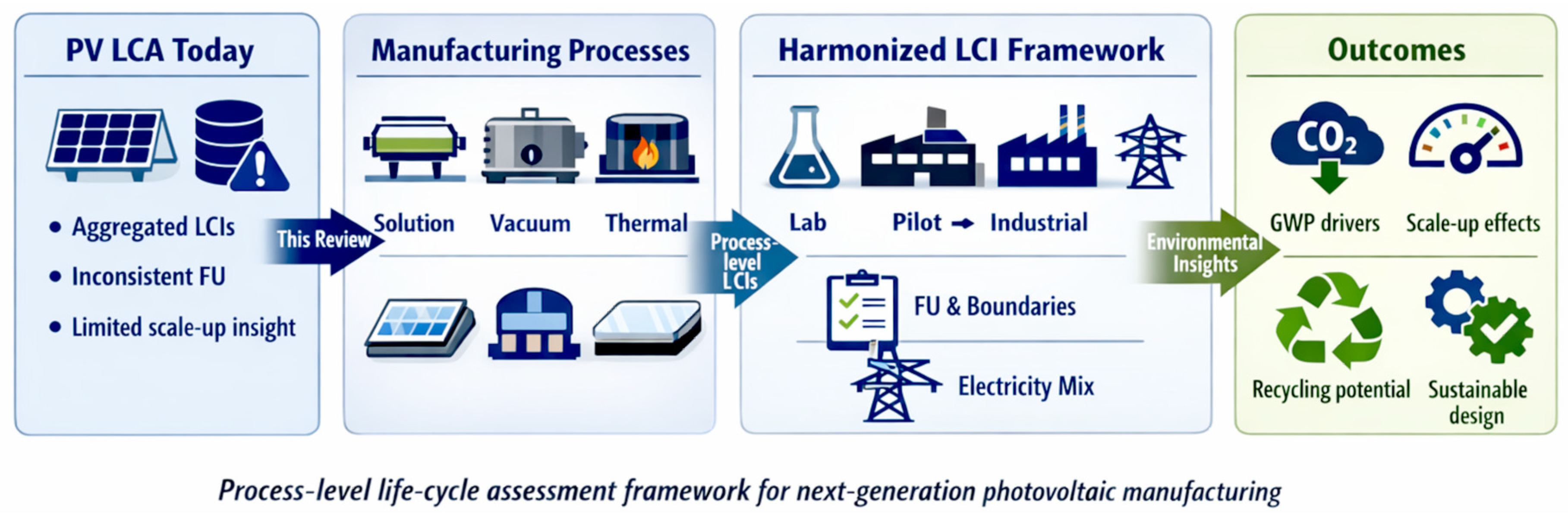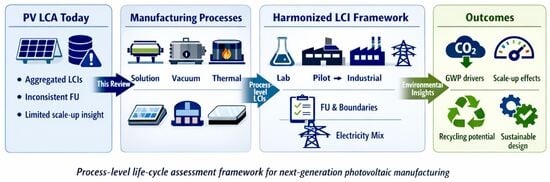This review therefore aims to: (i) compile and critically analyze process-level LCIs reported for innovative PV manufacturing routes, including R2R, vacuum, and solution-processed lines; (ii) quantify scale-up dynamics (lab->pilot->industrial) and sensitivity to yield, throughput, and electricity carbon intensity; (iii) propose standardized methodological rules and open-access LCI templates to enhance comparability, reproducibility, and integration with techno-economic assessments. By shifting the analytical focus from technology class to manufacturing process, this work contributes a harmonized evidence base for evaluating environmental trade-offs at an industrial scale and supports the transition toward circular, low-carbon PV production.