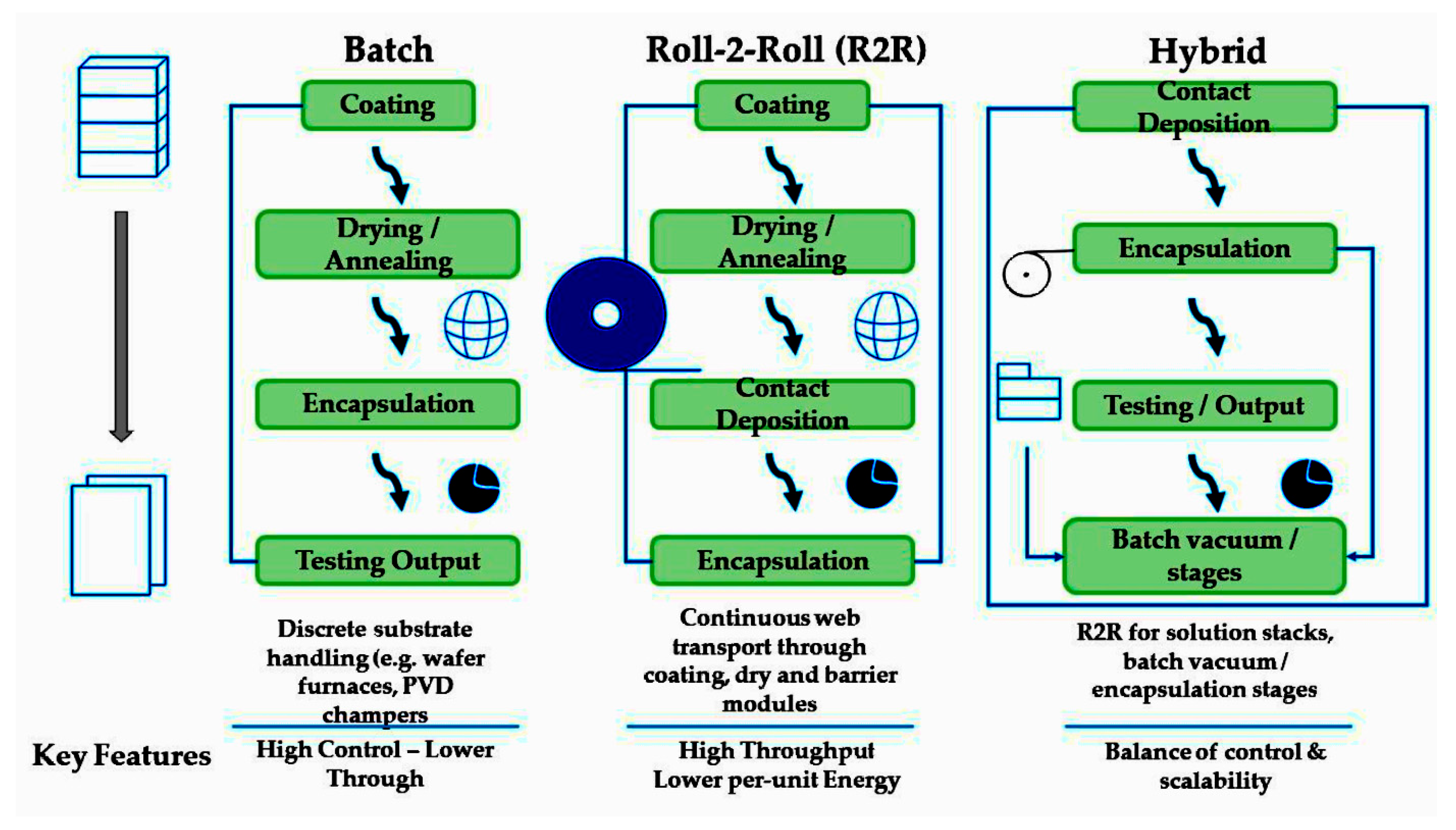 Manufacturing process coverage: deposition/coating, encapsulation, substrate preparation, metallization, and recycling;