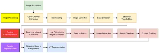 This section describes the procedure used to obtain the sequence of coordinate pairs representing the contour of an entity from a digital image. As illustrated in Figure 1, the method is organized into a pipeline composed of three main stages, each with adjustable parameters that allow adaptation to the characteristics of the scene and ensure result accuracy.