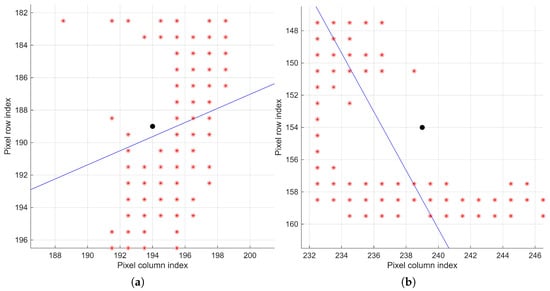 If the highest edge magnitude within is below , the region is skipped from analysis. Conversely, if two or more pixels exceed this threshold, the characterization process begins by fitting a line to the valid pixels. The line that best represents the contour points within the region is denoted .
