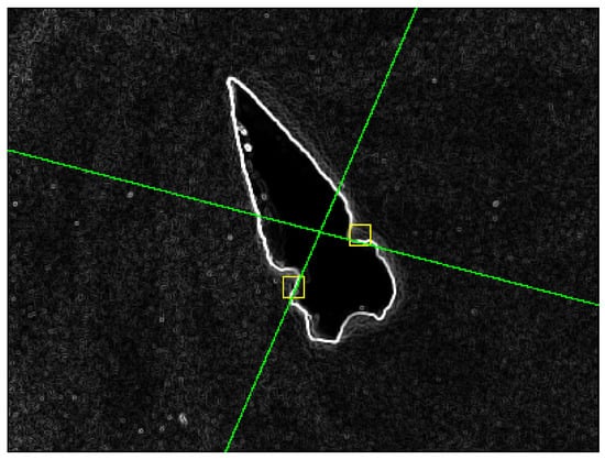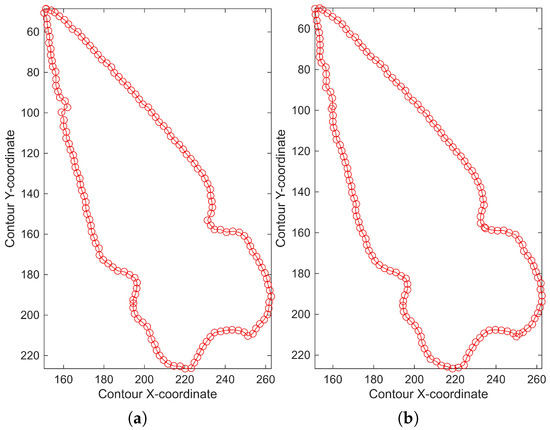 Figure 5 shows two regions of interest containing a valid contour, used to illustrate the procedure sequence. The region selected on the left side of the shape is denoted , while the one on the right side is identified as . In both cases, a window size of pixels is considered.